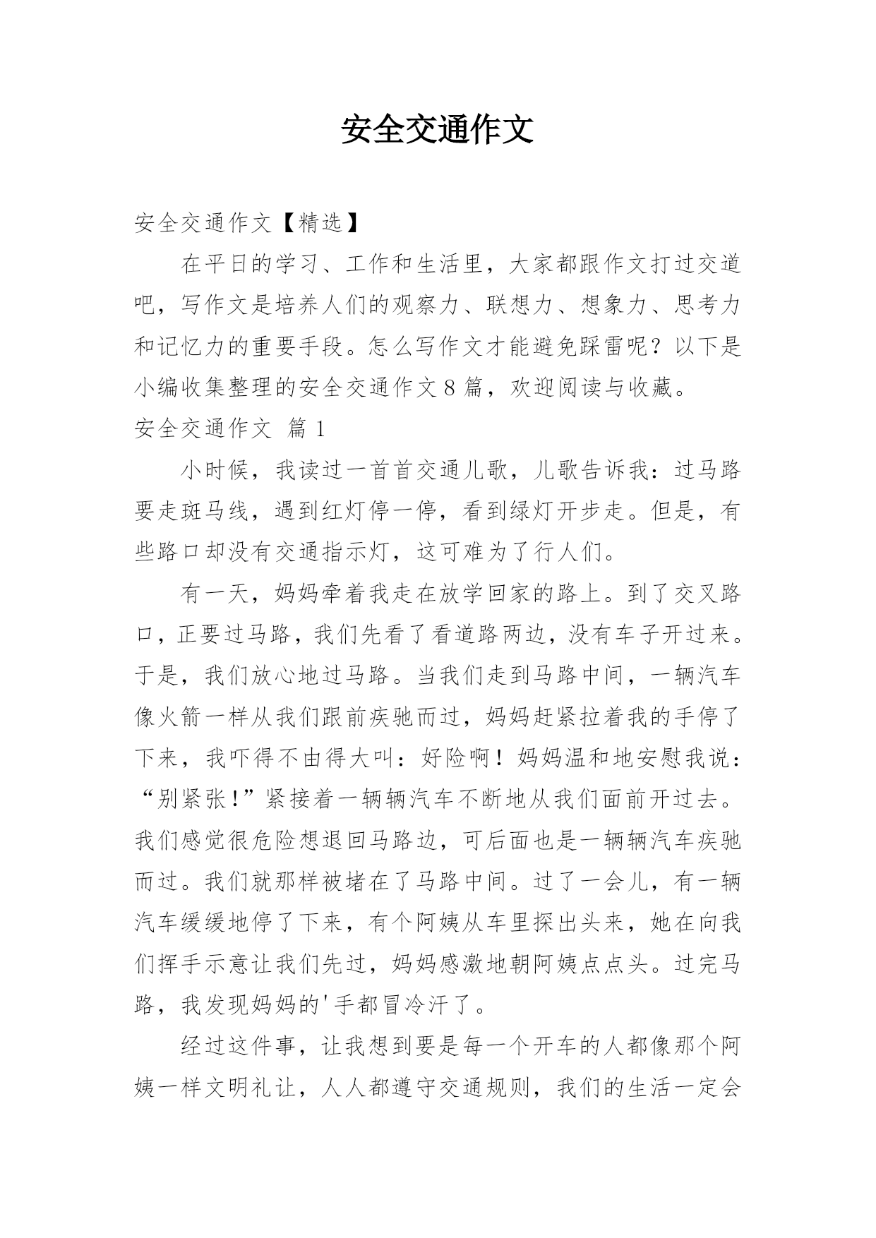 安全交通作文安全交通作文【精选】在平日的学习、工作和生活里,大家都跟作文打过交道吧,写作文是培养人们的观察力、联想力、想象力、思考力和记忆力的重要手段。怎么写作文才能避免踩雷呢?以下是小编收集整理的安全交通作文8篇,欢迎阅读与收藏。安全交通作文篇1小时候,我读过一首首交通儿歌,儿歌告诉我:过马路要走斑马线,遇到红灯停一停,看到绿灯开步走。但是,有些路口却没有交通指示灯,这可难为了行人们。有一天,妈妈牵着我走在放学回家的路上。到了交叉路口,正要过马路,我们先看了看道路两边,没有车子开过来。于是,我们放心地过