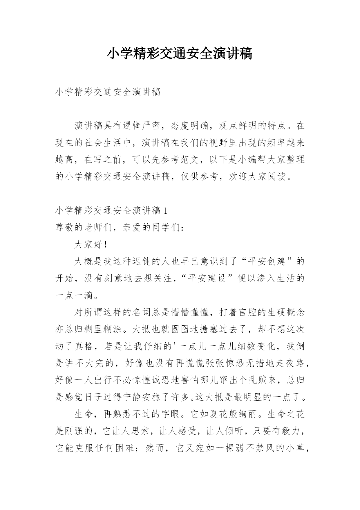 小学精彩交通安全演讲稿小学精彩交通安全演讲稿演讲稿具有逻辑严密,态度明确,观点鲜明的特点。在现在的社会生活中,演讲稿在我们的视野里出现的频率越来越高,在写之前,可以先参考范文,以下是小编帮大家整理的小学精彩交通安全演讲稿,仅供参考,欢迎大家阅读。小学精彩交通安全演讲稿1尊敬的老师们,亲爱的同学们:大家好!大概是我这种迟钝的人也早已意识到了“平安创建”的开始,没有刻意地去想关注,“平安建设”便以渗入生活的一点一滴。对所谓这样的名词总是懵懵懂懂,打着官腔的生硬概念亦总归糊里糊涂。大抵也就囫囵地搪塞过去了,却不