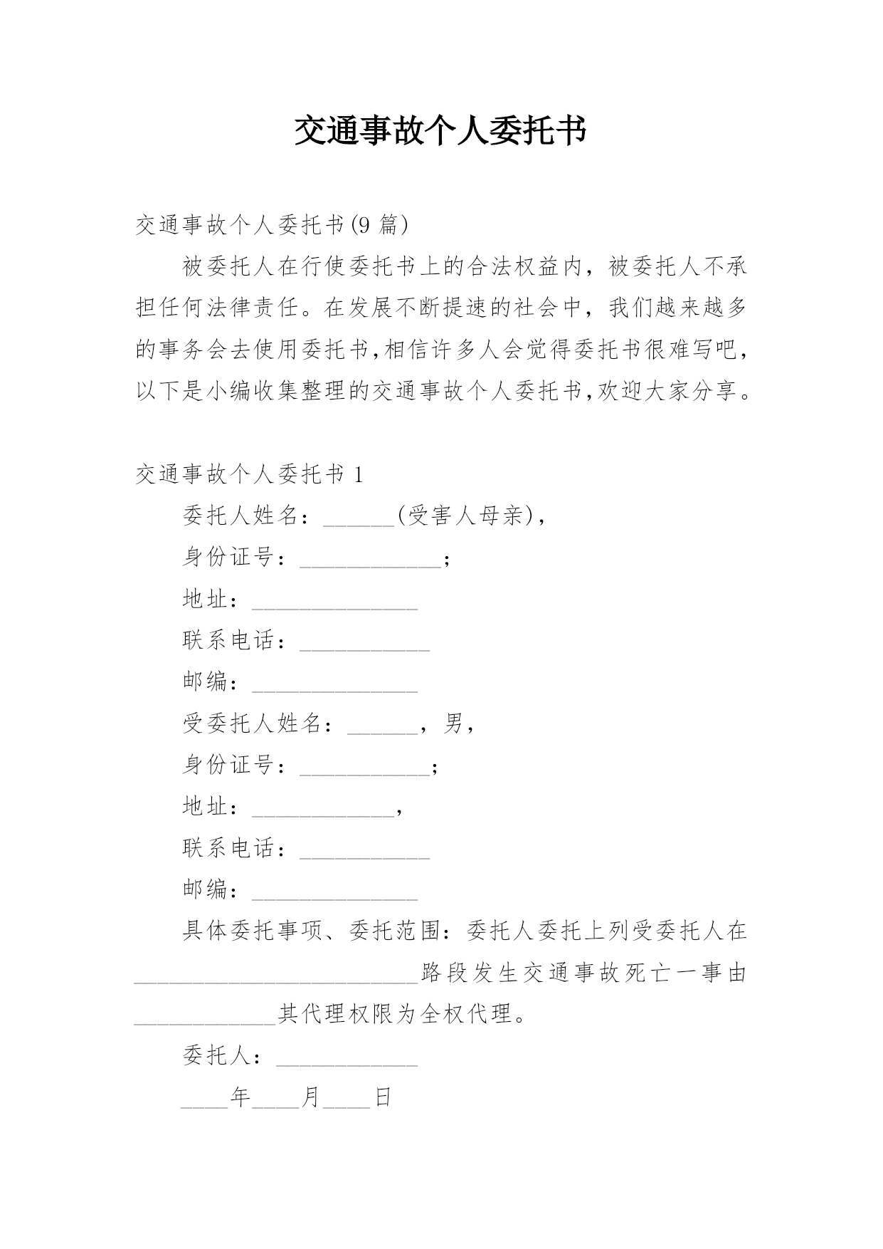 交通事故个人委托书交通事故个人委托书(9篇)被委托人在行使委托书上的合法权益内,被委托人不承担任何法律责任。在发展不断提速的社会中,我们越来越多的事务会去使用委托书,相信许多人会觉得委托书很难写吧,以下是小编收集整理的交通事故个人委托书,欢迎大家分享。交通事故个人委托书1委托人姓名:______(受害人母亲),身份证号:____________;地址:______________联系电话:___________邮编:______________受委托人姓名:______,男,身份证号:__________