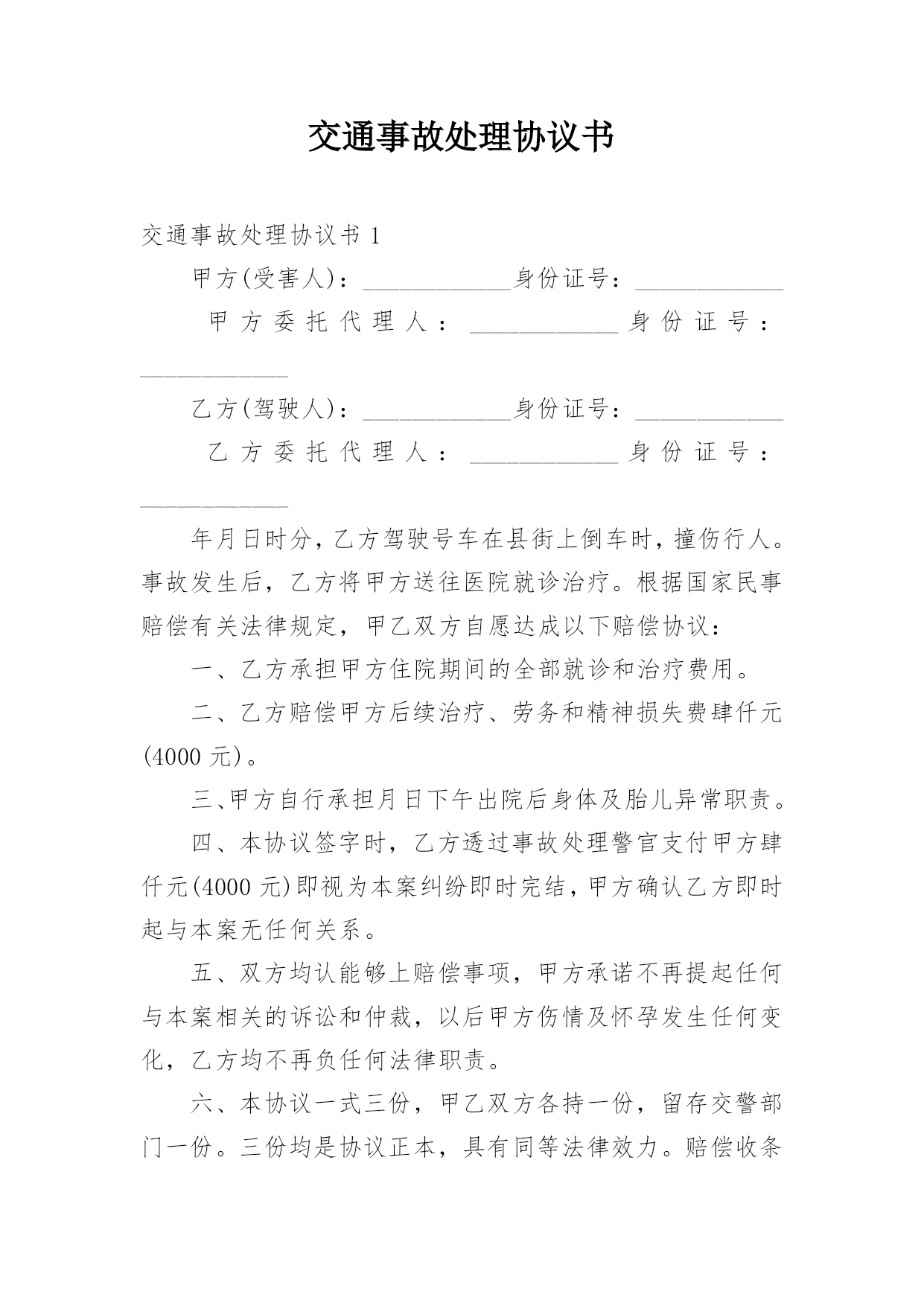 交通事故处理协议书交通事故处理协议书1甲方(受害人):____________身份证号:____________甲方委托代理人:____________身份证号:____________乙方(驾驶人):____________身份证号:____________乙方委托代理人:____________身份证号:____________年月日时分,乙方驾驶号车在县街上倒车时,撞伤行人。事故发生后,乙方将甲方送往医院就诊治疗。根据国家民事赔偿有关法律规定,甲乙双方自愿达成以下赔偿协议:一、乙方承担甲方住院期间的