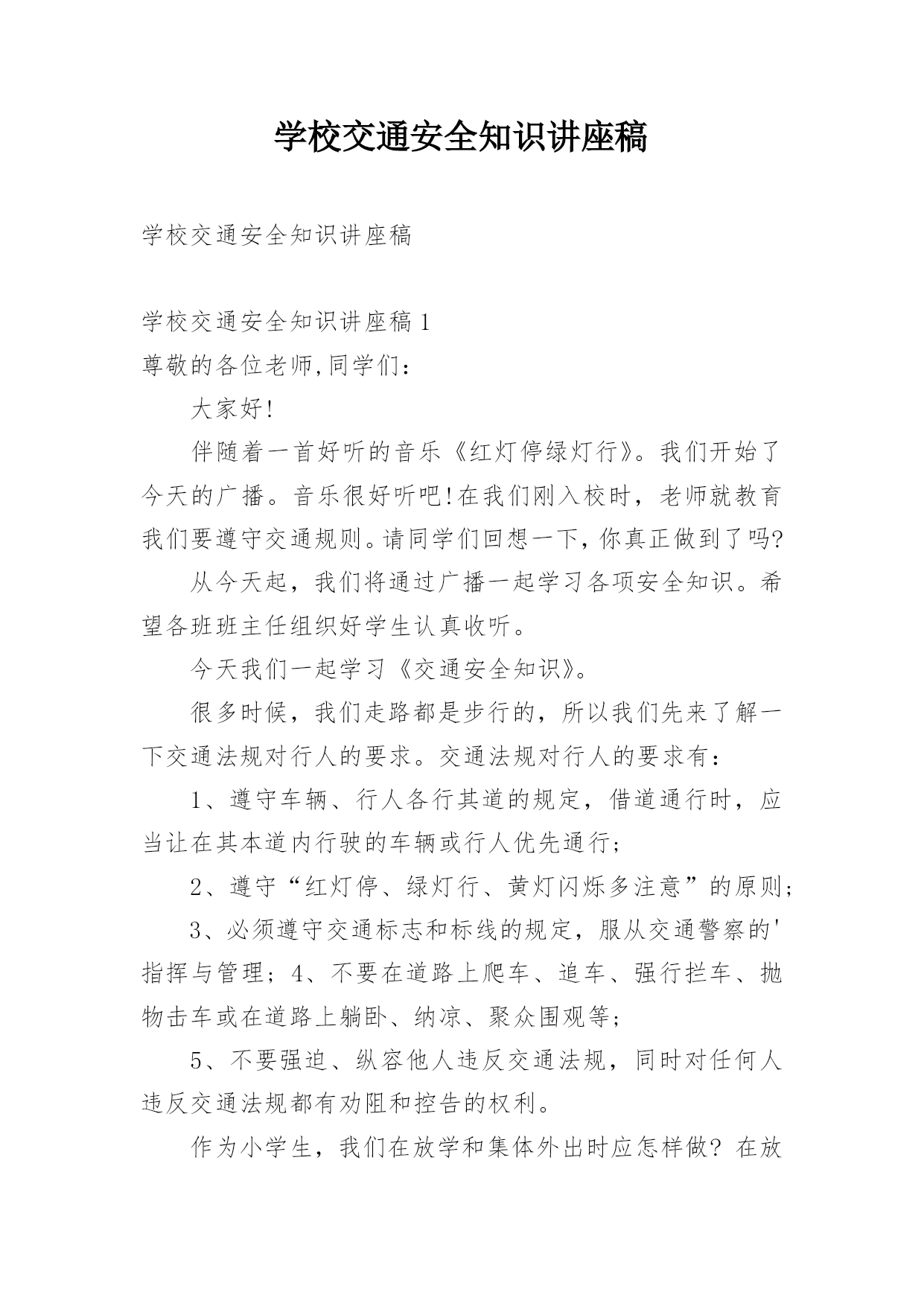 学校交通安全知识讲座稿学校交通安全知识讲座稿学校交通安全知识讲座稿1尊敬的各位老师,同学们:大家好!伴随着一首好听的音乐《红灯停绿灯行》。我们开始了今天的广播。音乐很好听吧!在我们刚入校时,老师就教育我们要遵守交通规则。请同学们回想一下,你真正做到了吗?从今天起,我们将通过广播一起学习各项安全知识。希望各班班主任组织好学生认真收听。今天我们一起学习《交通安全知识》。很多时候,我们走路都是步行的,所以我们先来了解一下交通法规对行人的要求。交通法规对行人的要求有:1、遵守车辆、行人各行其道的规定,借道通行时,