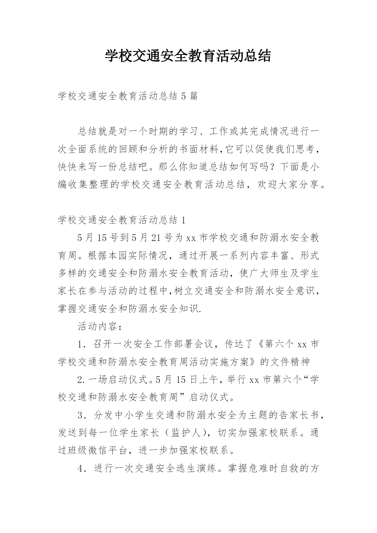 学校交通安全教育活动总结学校交通安全教育活动总结5篇总结就是对一个时期的学习、工作或其完成情况进行一次全面系统的回顾和分析的书面材料,它可以促使我们思考,快快来写一份总结吧。那么你知道总结如何写吗?下面是小编收集整理的学校交通安全教育活动总结,欢迎大家分享。学校交通安全教育活动总结15月15号到5月21号为xx市学校交通和防溺水安全教育周。根据本园实际情况,通过开展一系列内容丰富、形式多样的交通安全和防溺水安全教育活动,使广大师生及学生家长在参与活动的过程中,树立交通安全和防溺水安全意识,掌握交通安全和防