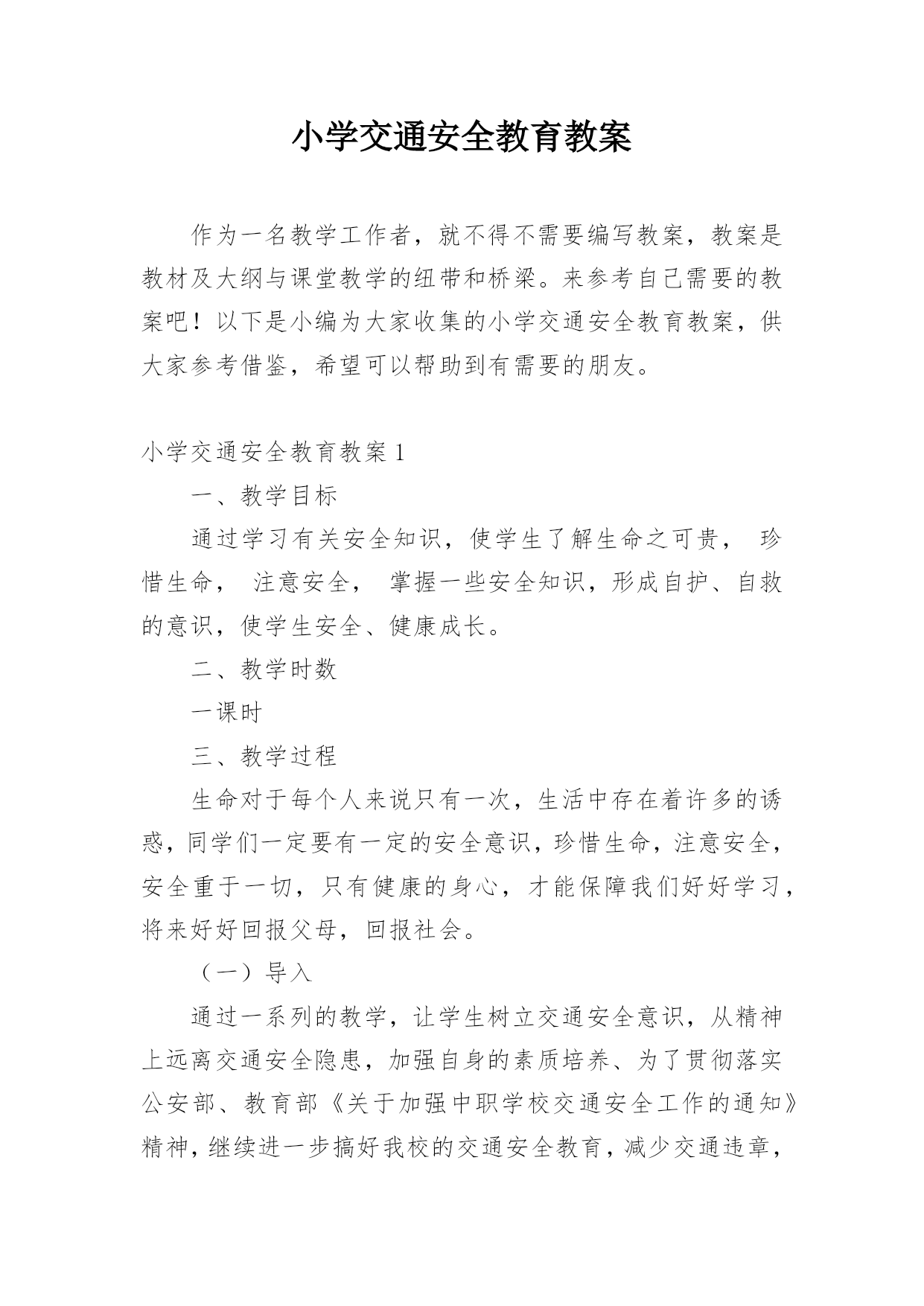 小学交通安全教育教案作为一名教学工作者,就不得不需要编写教案,教案是教材及大纲与课堂教学的纽带和桥梁。来参考自己需要的教案吧!以下是小编为大家收集的小学交通安全教育教案,供大家参考借鉴,希望可以帮助到有需要的朋友。小学交通安全教育教案1一、教学目标通过学习有关安全知识,使学生了解生命之可贵,珍惜生命,注意安全,掌握一些安全知识,形成自护、自救的意识,使学生安全、健康成长。二、教学时数一课时三、教学过程生命对于每个人来说只有一次,生活中存在着许多的诱惑,同学们一定要有一定的安全意识,珍惜生命,注意安全,安全