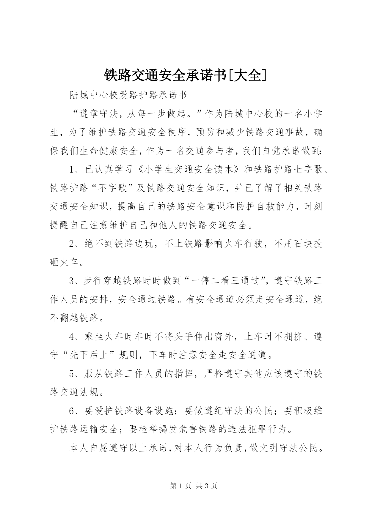 第PAGE\*Arabic\*MERGEFORMAT3页共NUMPAGES\*MERGEFORMAT3页铁路交通安全承诺书[大全]陆城中心校爱路护路承诺书“遵章守法,从每一步做起。”作为陆城中心校的一名小学生,为了维护铁路交通安全秩序,预防和减少铁路交通事故,确保我们生命健康安全,作为一名交通参与者,我们自觉承诺做到:1、已认真学习《小学生交通安全读本》和铁路护路七字歌、铁路护路“不字歌”及铁路交通安全知识,并已了解了相关铁路交通安全知识,提高自己的铁路安全意识和防护自救能力,时刻提醒自己注意