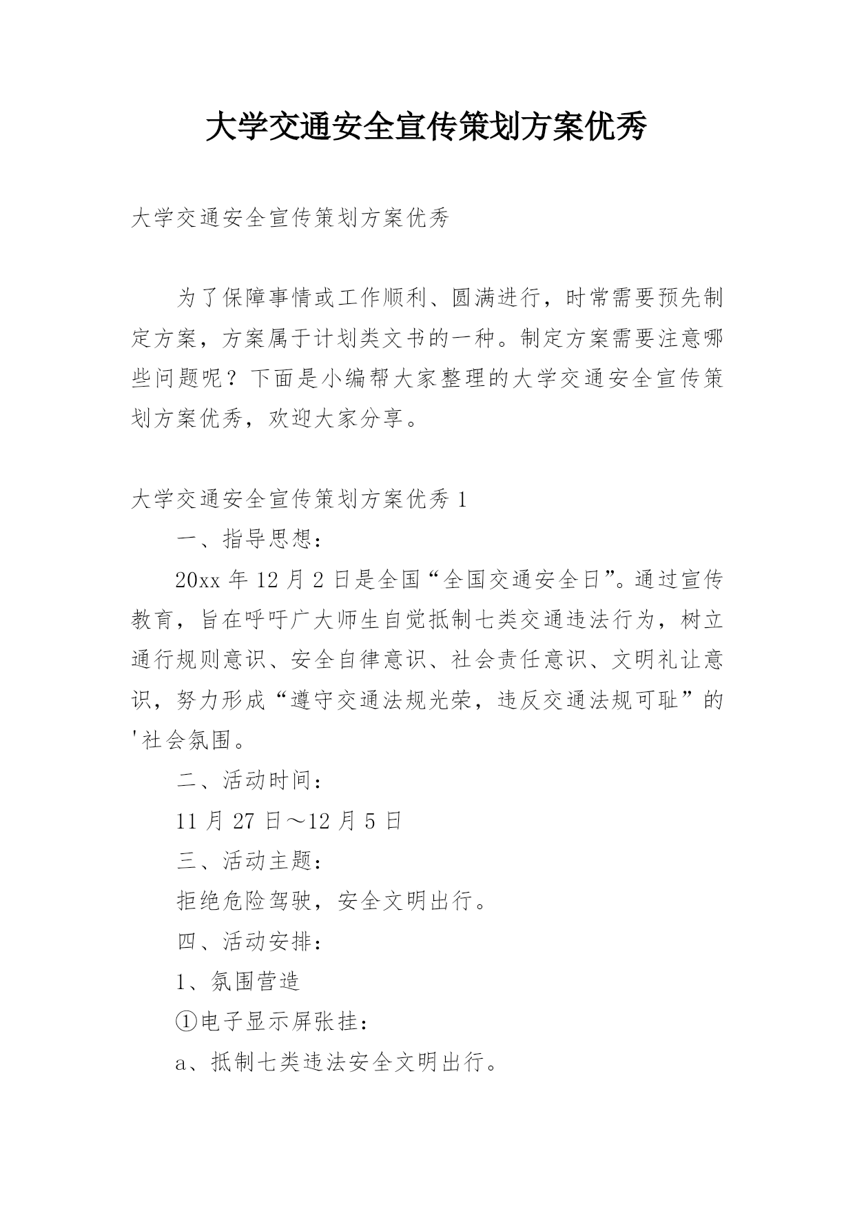 大学交通安全宣传策划方案优秀大学交通安全宣传策划方案优秀为了保障事情或工作顺利、圆满进行,时常需要预先制定方案,方案属于计划类文书的一种。制定方案需要注意哪些问题呢?下面是小编帮大家整理的大学交通安全宣传策划方案优秀,欢迎大家分享。大学交通安全宣传策划方案优秀1一、指导思想:20xx年12月2日是全国“全国交通安全日”。通过宣传教育,旨在呼吁广大师生自觉抵制七类交通违法行为,树立通行规则意识、安全自律意识、社会责任意识、文明礼让意识,努力形成“遵守交通法规光荣,违反交通法规可耻”的'社会氛围。二、活动时间