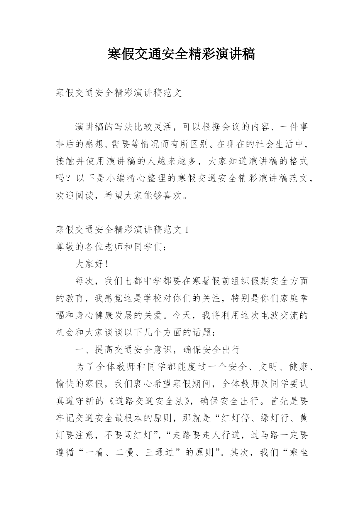 寒假交通安全精彩演讲稿寒假交通安全精彩演讲稿范文演讲稿的写法比较灵活,可以根据会议的内容、一件事事后的感想、需要等情况而有所区别。在现在的社会生活中,接触并使用演讲稿的人越来越多,大家知道演讲稿的格式吗?以下是小编精心整理的寒假交通安全精彩演讲稿范文,欢迎阅读,希望大家能够喜欢。寒假交通安全精彩演讲稿范文1尊敬的各位老师和同学们:大家好!每次,我们七都中学都要在寒暑假前组织假期安全方面的教育,我感觉这是学校对你们的关注,特别是你们家庭幸福和身心健康发展的关爱。今天,我将利用这次电波交流的机会和大家谈谈以下