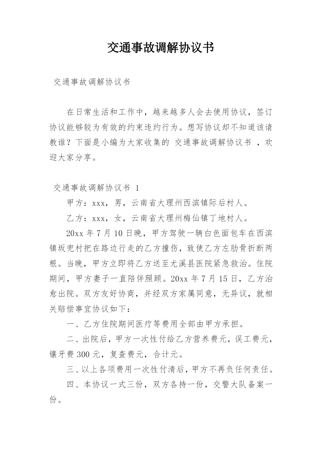 交通事故调解协议书交通事故调解协议书在日常生活和工作中,越来越多人会去使用协议,签订协议能够较为有效的约束违约行为。想写协议却不知道该请教谁?下面是小编为大家收集的交通事故调解协议书,欢迎大家分享。交通事故调解协议书1甲方:xxx,男,云南省大理州西滨镇际后村人。乙方:xxx,女,云南省大理州梅仙镇丁地村人。20xx年7月10日晚,甲方驾驶一辆白色面包车在西滨镇坂兜村把在路边行走的乙方撞伤,致使乙方左肋骨折断两根。当晚,甲方立即将乙方送至尤溪县医院紧急救治。住院期间,甲方妻子一直陪伴照顾。20xx年7月1