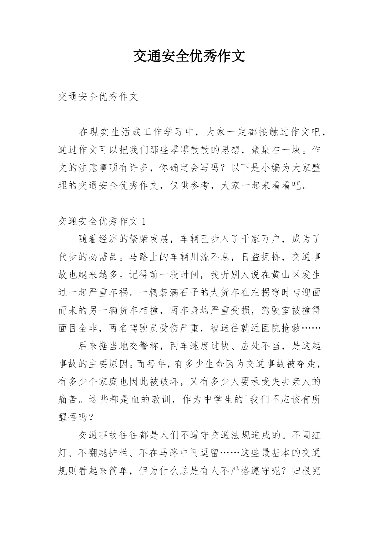 交通安全优秀作文交通安全优秀作文在现实生活或工作学习中,大家一定都接触过作文吧,通过作文可以把我们那些零零散散的思想,聚集在一块。作文的注意事项有许多,你确定会写吗?以下是小编为大家整理的交通安全优秀作文,仅供参考,大家一起来看看吧。交通安全优秀作文1随着经济的繁荣发展,车辆已步入了千家万户,成为了代步的必需品。马路上的车辆川流不息,日益拥挤,交通事故也越来越多。记得前一段时间,我听别人说在黄山区发生过一起严重车祸。一辆装满石子的大货车在左拐弯时与迎面而来的另一辆货车相撞,两车身均严重受损,驾驶室被撞得面