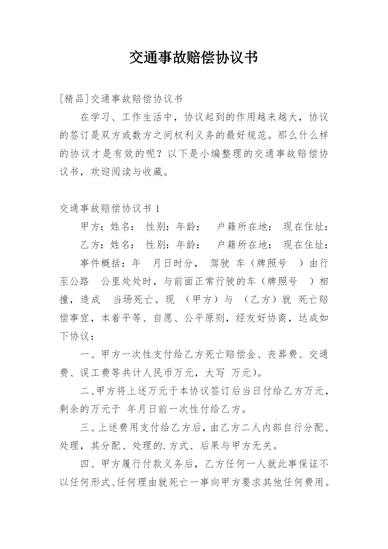 交通事故赔偿协议书[精品]交通事故赔偿协议书在学习、工作生活中,协议起到的作用越来越大,协议的签订是双方或数方之间权利义务的最好规范。那么什么样的协议才是有效的呢?以下是小编整理的交通事故赔偿协议书,欢迎阅读与收藏。交通事故赔偿协议书1甲方:姓名:性别:年龄:户籍所在地:现在住址:乙方:姓名:性别:年龄:户籍所在地:现在住址:事件概括:年月日时分,驾驶车(牌照号)由行至公路公里处处时,与前面正常行驶的车(牌照号)相撞,造成当场死亡。现(甲方)与(乙方)就死亡赔偿事宜,本着平等、自愿、公平原则,经友好协商,