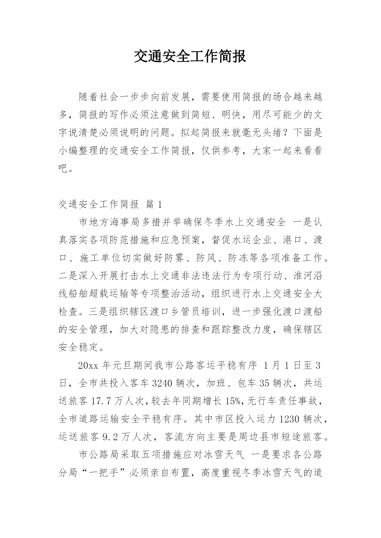 交通安全工作简报随着社会一步步向前发展,需要使用简报的场合越来越多,简报的写作必须注意做到简短、明快,用尽可能少的文字说清楚必须说明的问题。拟起简报来就毫无头绪?下面是小编整理的交通安全工作简报,仅供参考,大家一起来看看吧。交通安全工作简报篇1市地方海事局多措并举确保冬季水上交通安全一是认真落实各项防范措施和应急预案,督促水运企业、港口、渡口、施工单位切实做好防雾、防风、防冻等各项准备工作。二是深入开展打击水上交通非法违法行为专项行动、淮河沿线船舶超载运输等专项整治活动,组织进行水上交通安全大检查。三是组