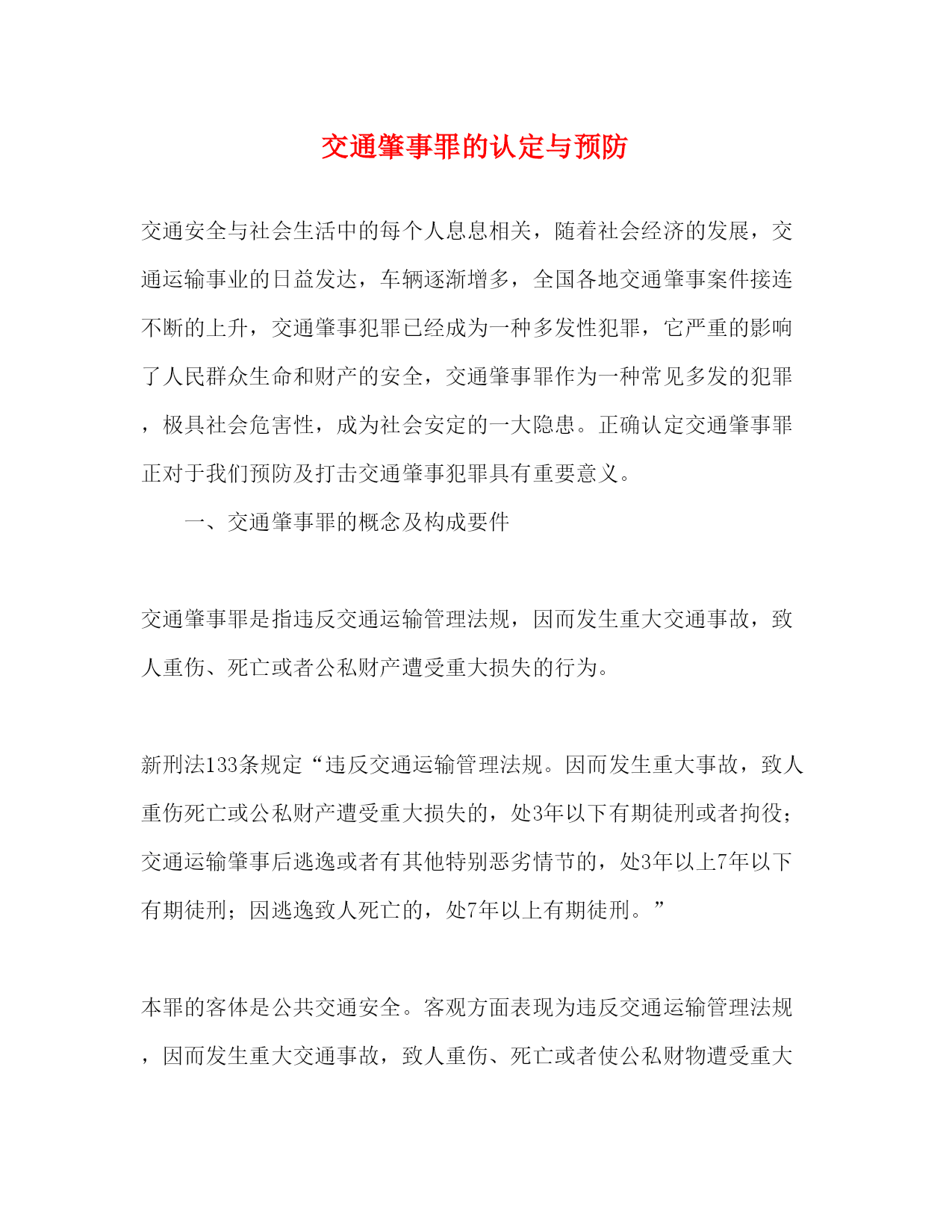 PAGE此资料由网络收集而来,如有侵权请告知上传者立即删除。资料共分享,我们负责传递知识。交通肇事罪的认定与预防交通安全与社会生活中的每个人息息相关,随着社会经济的发展,交通运输事业的日益发达,车辆逐渐增多,全国各地交通肇事案件接连不断的上升,交通肇事犯罪已经成为一种多发性犯罪,它严重的影响了人民群众生命和财产的安全,交通肇事罪作为一种常见多发的犯罪,极具社会危害性,成为社会安定的一大隐患。正确认定交通肇事罪正对于我们预防及打击交通肇事犯罪具有重要意义。一、交通肇事罪的概念及构成要件交通肇事罪是指违