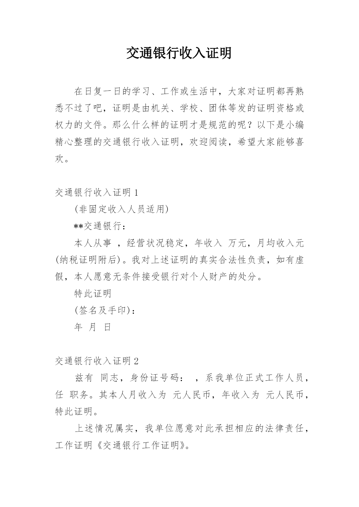 交通银行收入证明在日复一日的学习、工作或生活中,大家对证明都再熟悉不过了吧,证明是由机关、学校、团体等发的证明资格或权力的文件。那么什么样的证明才是规范的呢?以下是小编精心整理的交通银行收入证明,欢迎阅读,希望大家能够喜欢。交通银行收入证明1(非固定收入人员适用)**交通银行:本人从事,经营状况稳定,年收入万元,月均收入元(纳税证明附后)。我对上述证明的真实合法性负责,如有虚假,本人愿意无条件接受银行对个人财产的处分。特此证明(签名及手印):年月日交通银行收入证明2兹有同志,身份证号码:,系我单位正式工作