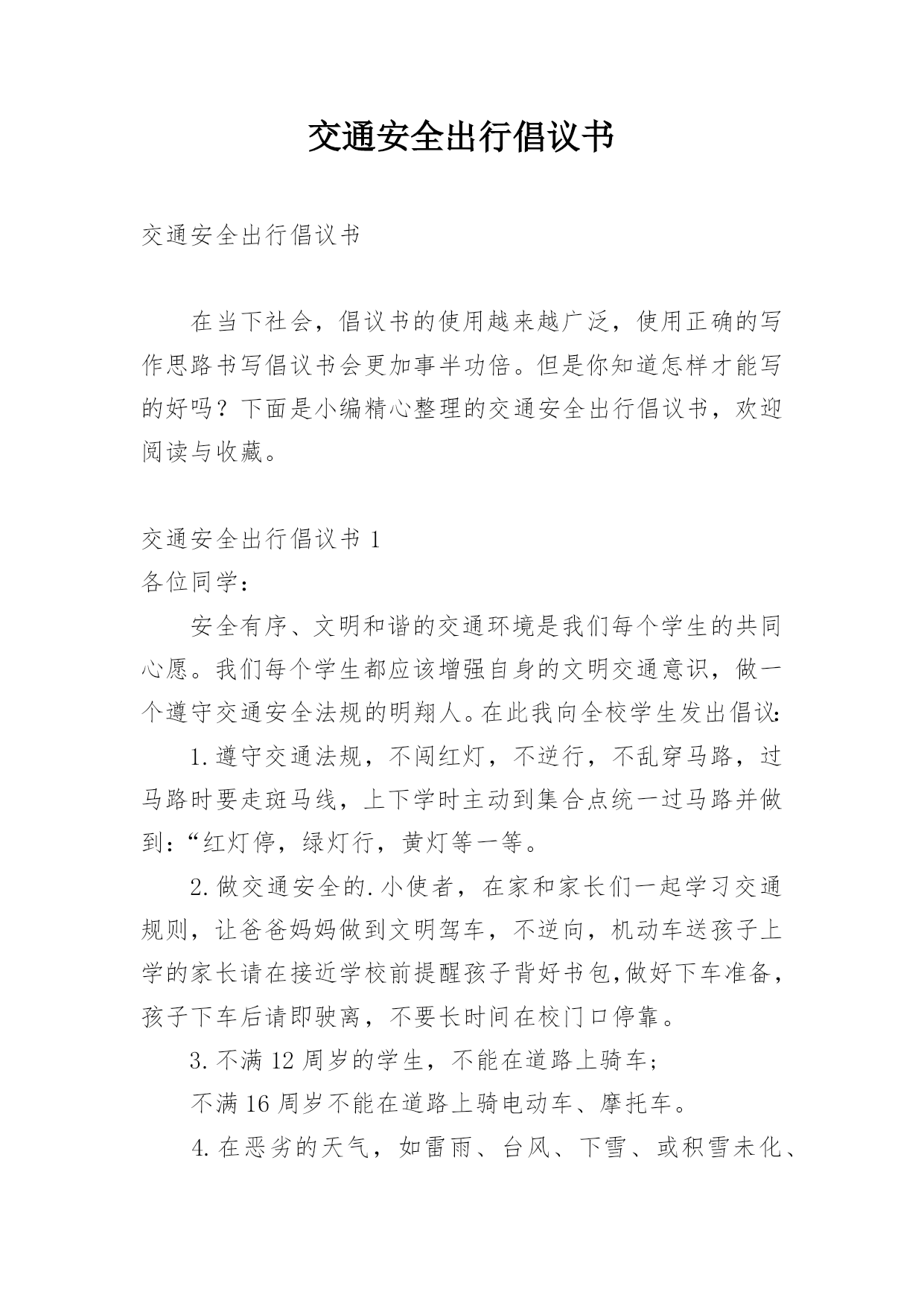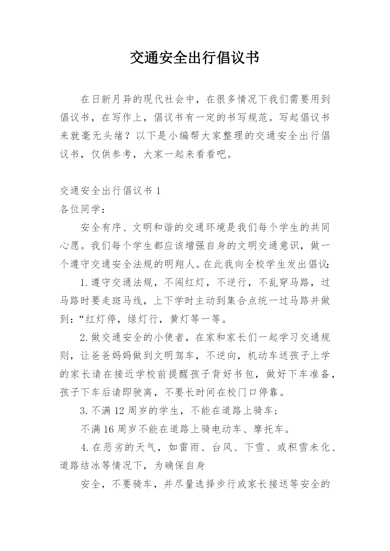 交通安全出行倡议书交通安全出行倡议书在当下社会,倡议书的使用越来越广泛,使用正确的写作思路书写倡议书会更加事半功倍。但是你知道怎样才能写的好吗?下面是小编精心整理的交通安全出行倡议书,欢迎阅读与收藏。交通安全出行倡议书1各位同学:安全有序、文明和谐的交通环境是我们每个学生的共同心愿。我们每个学生都应该增强自身的文明交通意识,做一个遵守交通安全法规的明翔人。在此我向全校学生发出倡议:1.遵守交通法规,不闯红灯,不逆行,不乱穿马路,过马路时要走斑马线,上下学时主动到集合点统一过马路并做到:“红灯停,绿灯行,黄