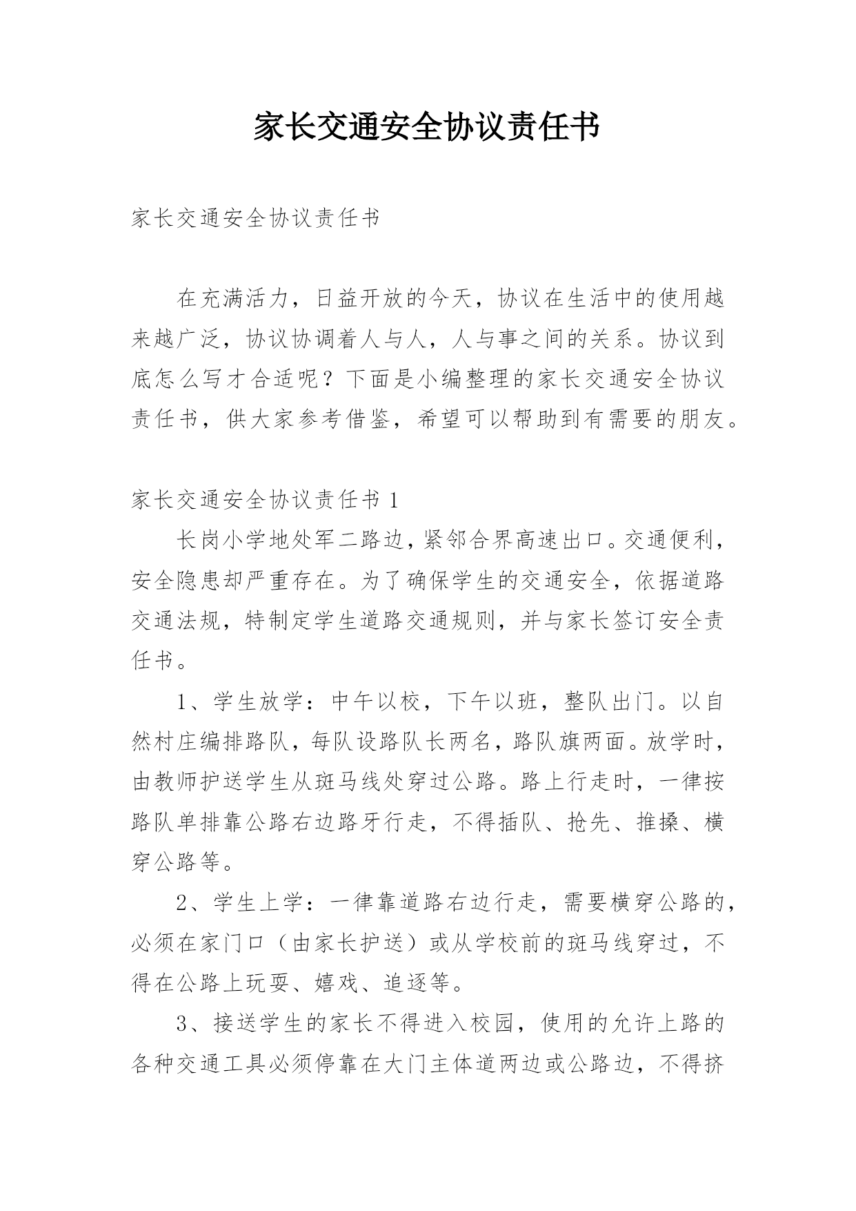 家长交通安全协议责任书家长交通安全协议责任书在充满活力,日益开放的今天,协议在生活中的使用越来越广泛,协议协调着人与人,人与事之间的关系。协议到底怎么写才合适呢?下面是小编整理的家长交通安全协议责任书,供大家参考借鉴,希望可以帮助到有需要的朋友。家长交通安全协议责任书1长岗小学地处军二路边,紧邻合界高速出口。交通便利,安全隐患却严重存在。为了确保学生的交通安全,依据道路交通法规,特制定学生道路交通规则,并与家长签订安全责任书。1、学生放学:中午以校,下午以班,整队出门。以自然村庄编排路队,每队设路队长两名
