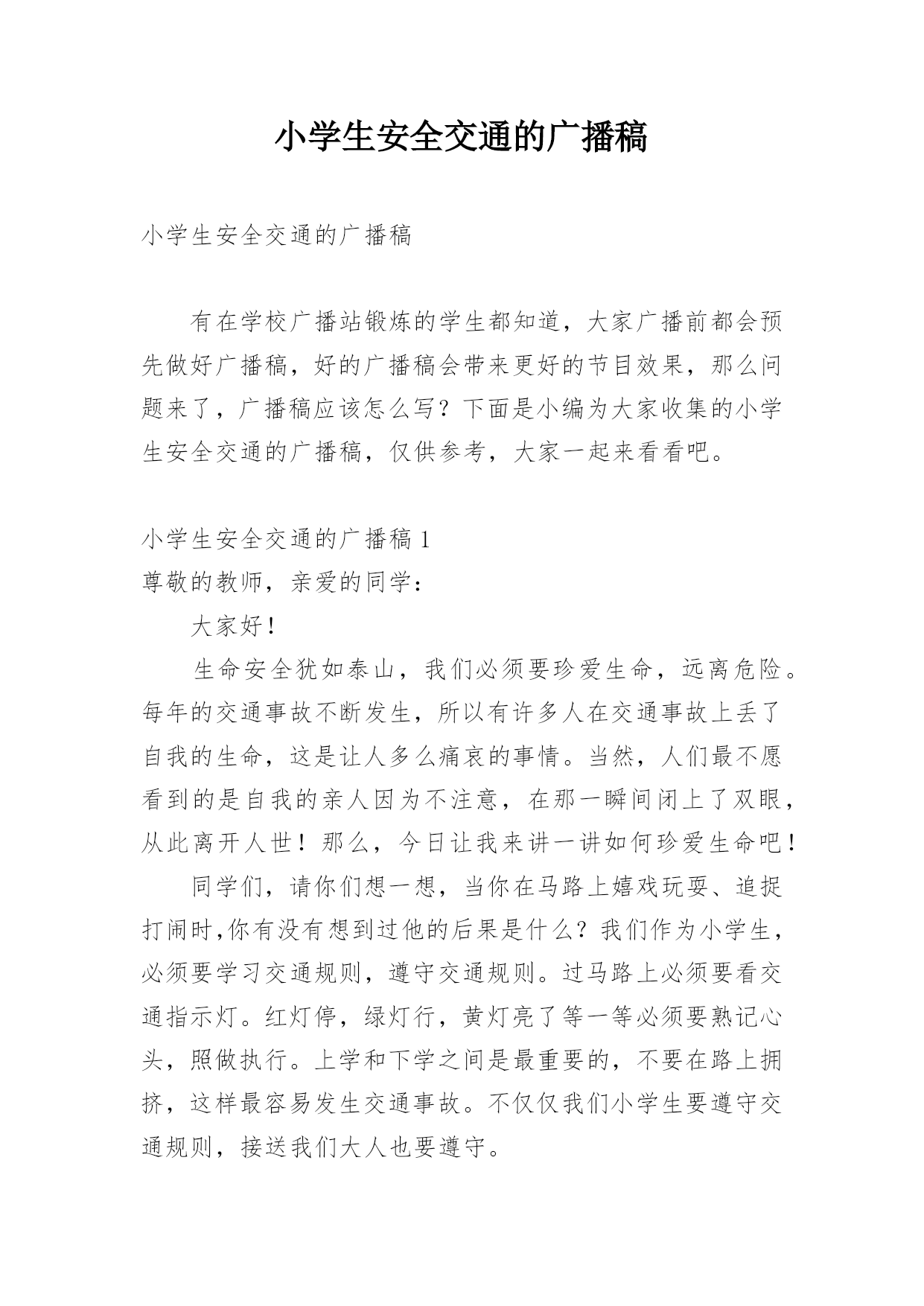 小学生安全交通的广播稿小学生安全交通的广播稿有在学校广播站锻炼的学生都知道,大家广播前都会预先做好广播稿,好的广播稿会带来更好的节目效果,那么问题来了,广播稿应该怎么写?下面是小编为大家收集的小学生安全交通的广播稿,仅供参考,大家一起来看看吧。小学生安全交通的广播稿1尊敬的教师,亲爱的同学:大家好!生命安全犹如泰山,我们必须要珍爱生命,远离危险。每年的交通事故不断发生,所以有许多人在交通事故上丢了自我的生命,这是让人多么痛哀的事情。当然,人们最不愿看到的是自我的亲人因为不注意,在那一瞬间闭上了双眼,从此离