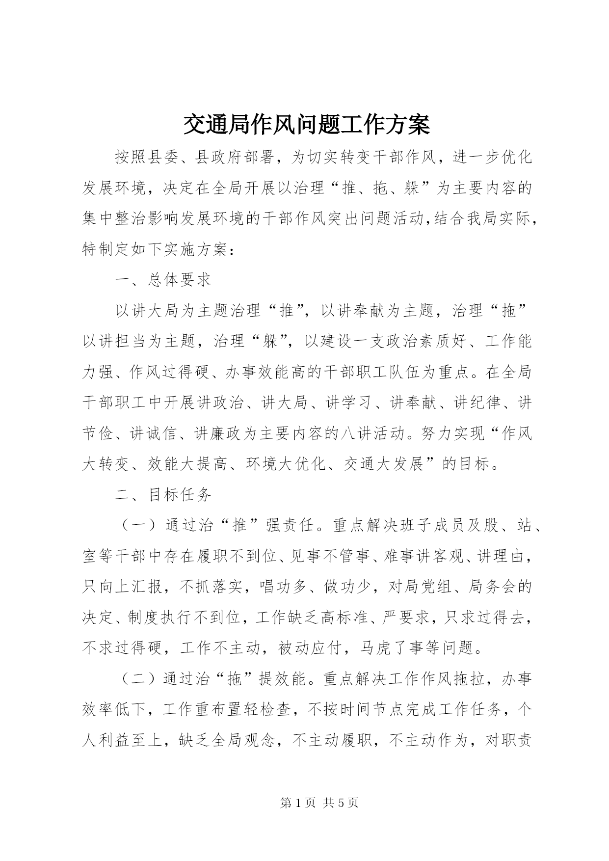 第PAGE\*Arabic\*MERGEFORMAT5页共NUMPAGES\*MERGEFORMAT5页交通局作风问题工作方案按照县委、县政府部署,为切实转变干部作风,进一步优化发展环境,决定在全局开展以治理“推、拖、躲”为主要内容的集中整治影响发展环境的干部作风突出问题活动,结合我局实际,特制定如下实施方案:一、总体要求以讲大局为主题治理“推”,以讲奉献为主题,治理“拖”以讲担当为主题,治理“躲”,以建设一支政治素质好、工作能力强、作风过得硬、办事效能高的干部职工队伍为重点。在全局干部职工中