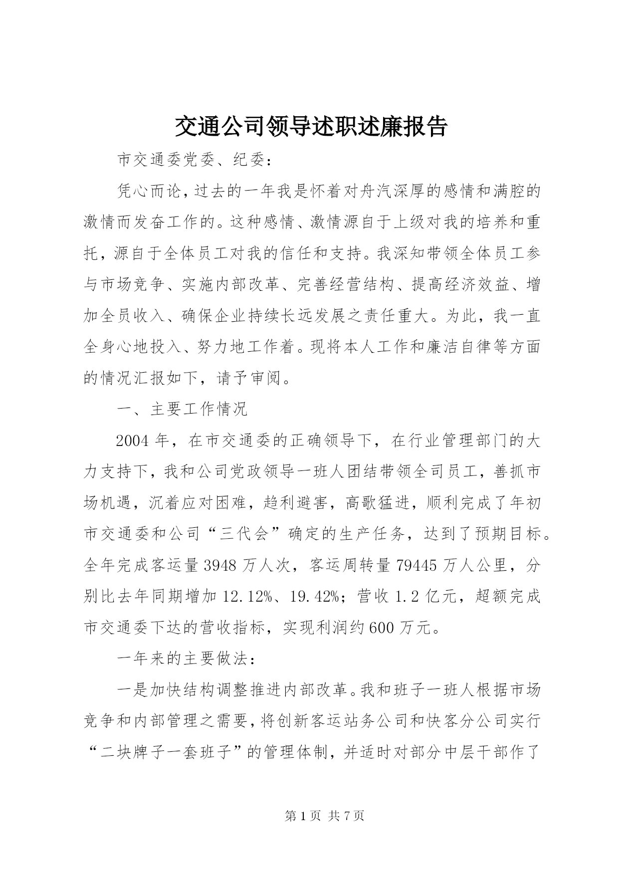 第PAGE\*Arabic\*MERGEFORMAT7页共NUMPAGES\*MERGEFORMAT7页交通公司领导述职述廉报告市交通委党委、纪委:凭心而论,过去的一年我是怀着对舟汽深厚的感情和满腔的激情而发奋工作的。这种感情、激情源自于上级对我的培养和重托,源自于全体员工对我的信任和支持。我深知带领全体员工参与市场竞争、实施内部改革、完善经营结构、提高经济效益、增加全员收入、确保企业持续长远发展之责任重大。为此,我一直全身心地投入、努力地工作着。现将本人工作和廉洁自律等方面的情况汇报如下,请