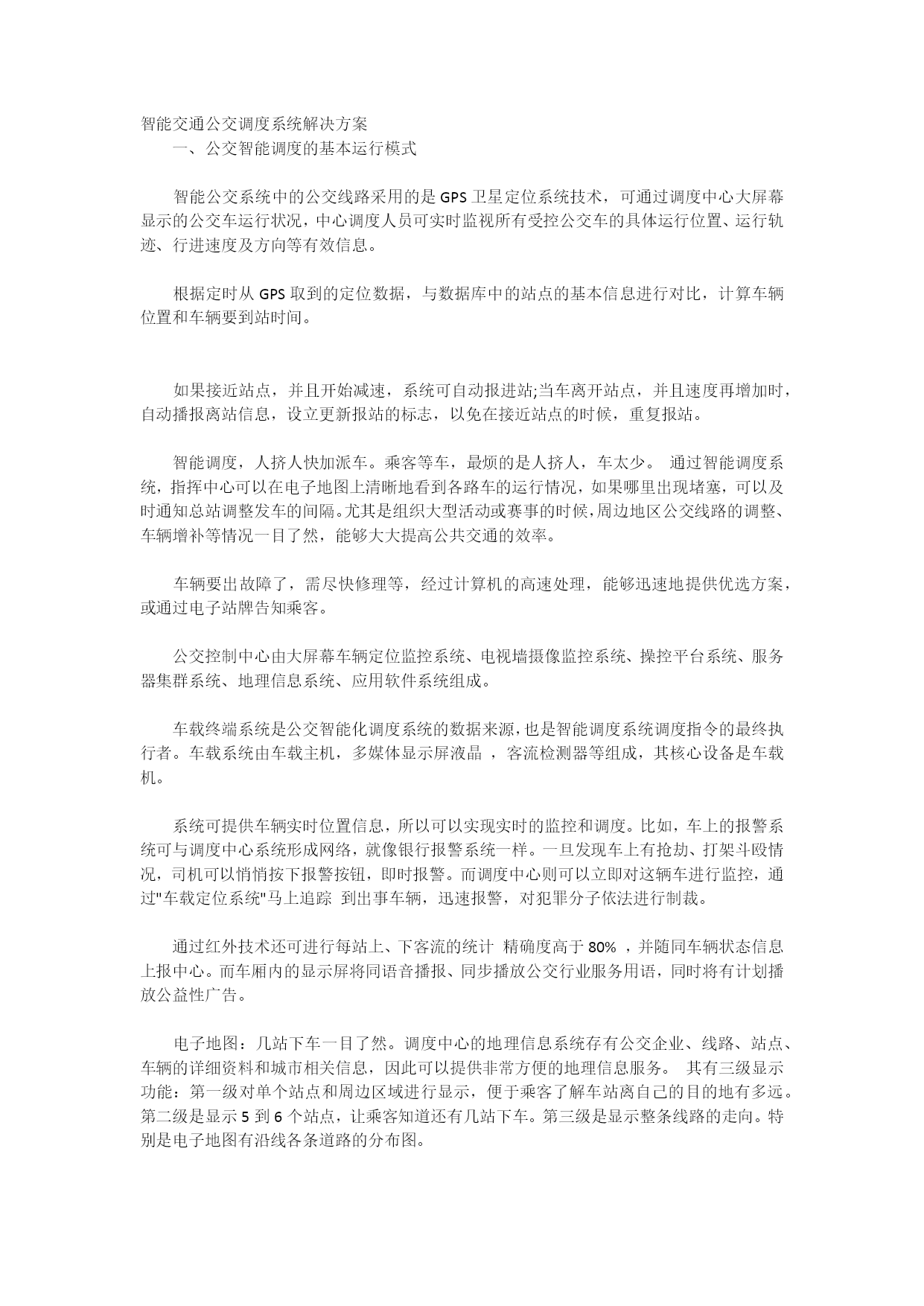 智能交通公交调度系统解决方案一、公交智能调度的基本运行模式智能公交系统中的公交线路采用的是GPS卫星定位系统技术,可通过调度中心大屏幕显示的公交车运行状况,中心调度人员可实时监视所有受控公交车的具体运行位置、运行轨迹、行进速度及方向等有效信息。根据定时从GPS取到的定位数据,与数据库中的站点的基本信息进行对比,计算车辆位置和车辆要到站时间。如果接近站点,并且开始减速,系统可自动报进站;当车离开站点,并且速度再增加时,自动播报离站信息,设立更新报站的标志,以免在接近站点的时候,重复报站。智能调度,人挤人快加