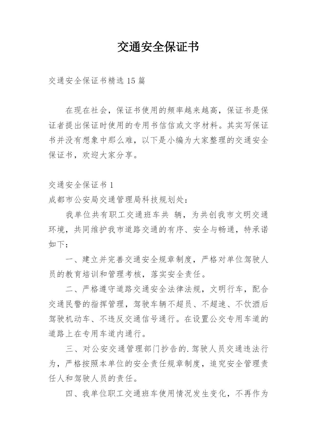 交通安全保证书交通安全保证书精选15篇在现在社会,保证书使用的频率越来越高,保证书是保证者提出保证时使用的专用书信信或文字材料。其实写保证书并没有想象中那么难,以下是小编为大家整理的交通安全保证书,欢迎大家分享。交通安全保证书1成都市公安局交通管理局科技规划处:我单位共有职工交通班车共辆,为共创我市文明交通环境,共同维护我市道路交通的有序、安全与畅通,特承诺如下:一、建立并完善交通安全规章制度,严格对单位驾驶人员的教育培训和管理考核,落实安全责任。二、严格遵守道路交通安全法律法规,文明行车,配合交通民警的