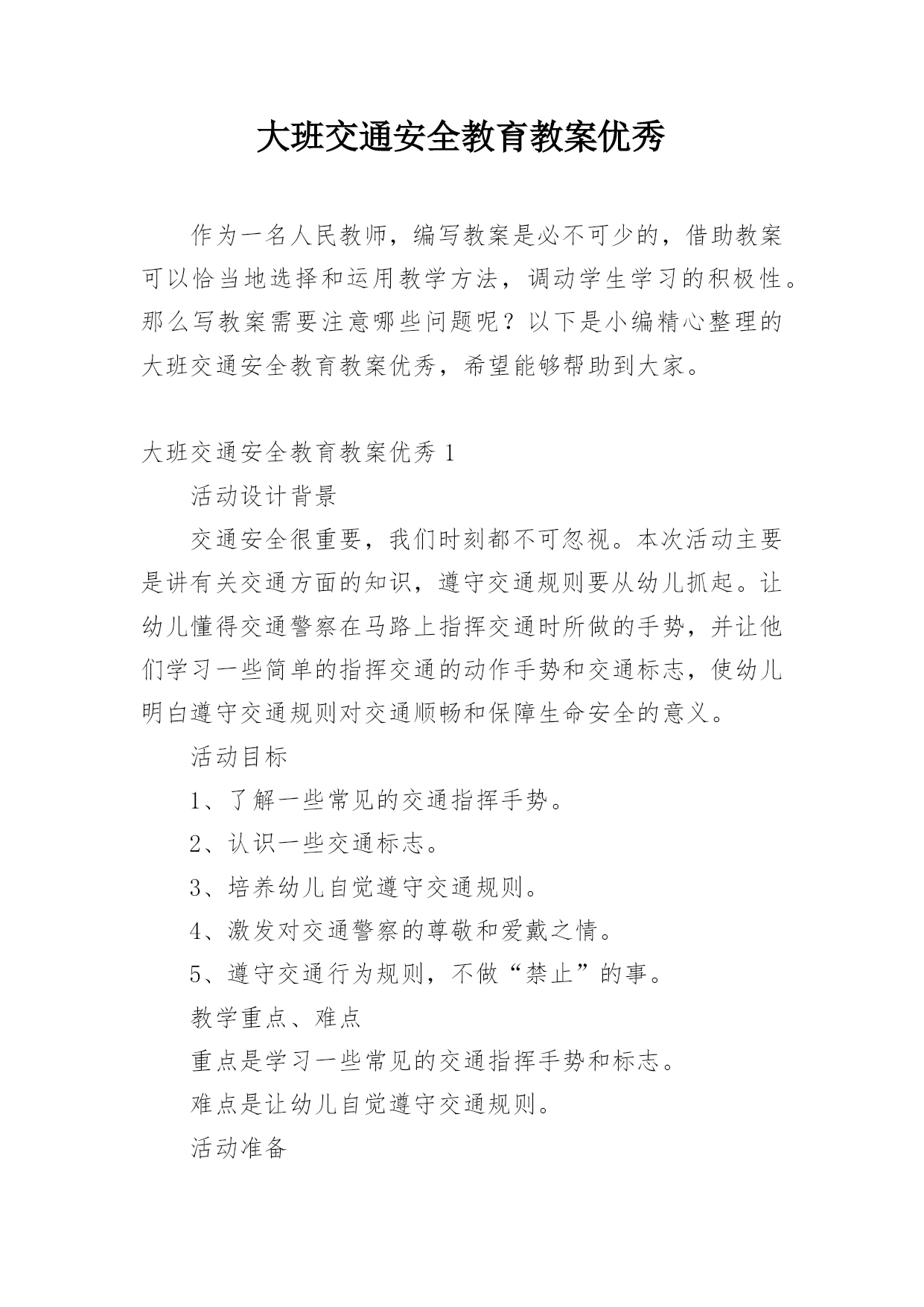 大班交通安全教育教案优秀作为一名人民教师,编写教案是必不可少的,借助教案可以恰当地选择和运用教学方法,调动学生学习的积极性。那么写教案需要注意哪些问题呢?以下是小编精心整理的大班交通安全教育教案优秀,希望能够帮助到大家。大班交通安全教育教案优秀1活动设计背景交通安全很重要,我们时刻都不可忽视。本次活动主要是讲有关交通方面的知识,遵守交通规则要从幼儿抓起。让幼儿懂得交通警察在马路上指挥交通时所做的手势,并让他们学习一些简单的指挥交通的动作手势和交通标志,使幼儿明白遵守交通规则对交通顺畅和保障生命安全的意义。
