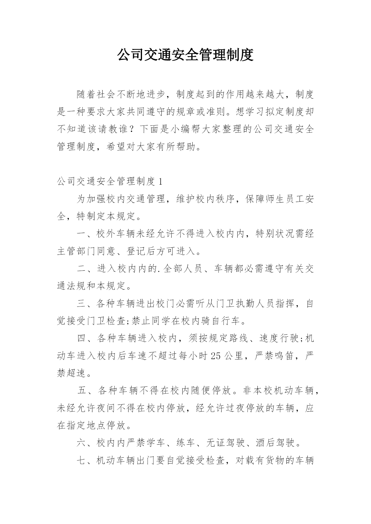 公司交通安全管理制度随着社会不断地进步,制度起到的作用越来越大,制度是一种要求大家共同遵守的规章或准则。想学习拟定制度却不知道该请教谁?下面是小编帮大家整理的公司交通安全管理制度,希望对大家有所帮助。公司交通安全管理制度1为加强校内交通管理,维护校内秩序,保障师生员工安全,特制定本规定。一、校外车辆未经允许不得进入校内内,特别状况需经主管部门同意、登记后方可进入。二、进入校内内的.全部人员、车辆都必需遵守有关交通法规和本规定。三、各种车辆进出校门必需听从门卫执勤人员指挥,自觉接受门卫检查;禁止同学在校内骑