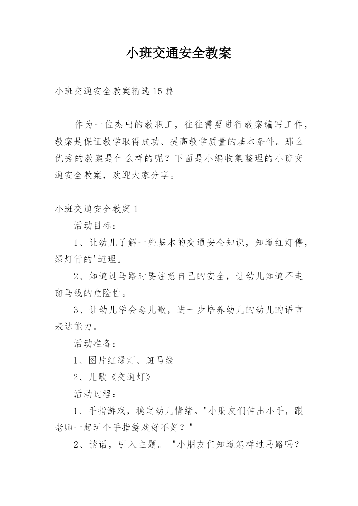 小班交通安全教案小班交通安全教案精选15篇作为一位杰出的教职工,往往需要进行教案编写工作,教案是保证教学取得成功、提高教学质量的基本条件。那么优秀的教案是什么样的呢?下面是小编收集整理的小班交通安全教案,欢迎大家分享。小班交通安全教案1活动目标:1、让幼儿了解一些基本的交通安全知识,知道红灯停,绿灯行的'道理。2、知道过马路时要注意自己的安全,让幼儿知道不走斑马线的危险性。3、让幼儿学会念儿歌,进一步培养幼儿的幼儿的语言表达能力。活动准备:1、图片红绿灯、斑马线2、儿歌《交通灯》活动过程:1、手指游戏,稳