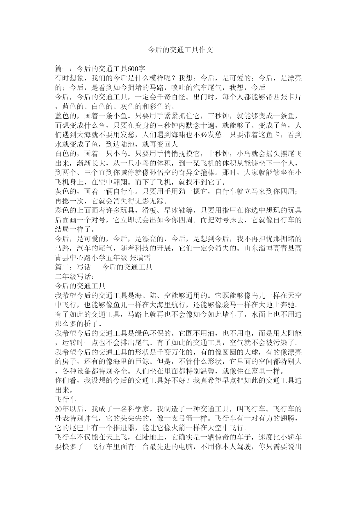 今后的交通工具作文篇一:今后的交通工具600字有时想象,我们的今后是什么模样呢?我想:今后,是可爱的;今后,是漂亮的;今后,是看到如今拥堵的马路,喷吐的汽车尾气,我想,今后今后,今后的交通工具,一定会千奇百怪。出门时,每个人都能够带四张卡片,蓝色的、白色的、灰色的和彩色的。蓝色的,画着一条小鱼。只要用手紧紧抓住它,三秒钟,就能够变成一条鱼,而想变成什么鱼,只要在变身的三秒钟内默念十遍,就能够了。变成了鱼,人们遇到大海就不要用发愁,人们遇到海啸也不必发愁。只要带着这鱼卡,看到水就变成了鱼,到达陆地,就再变回