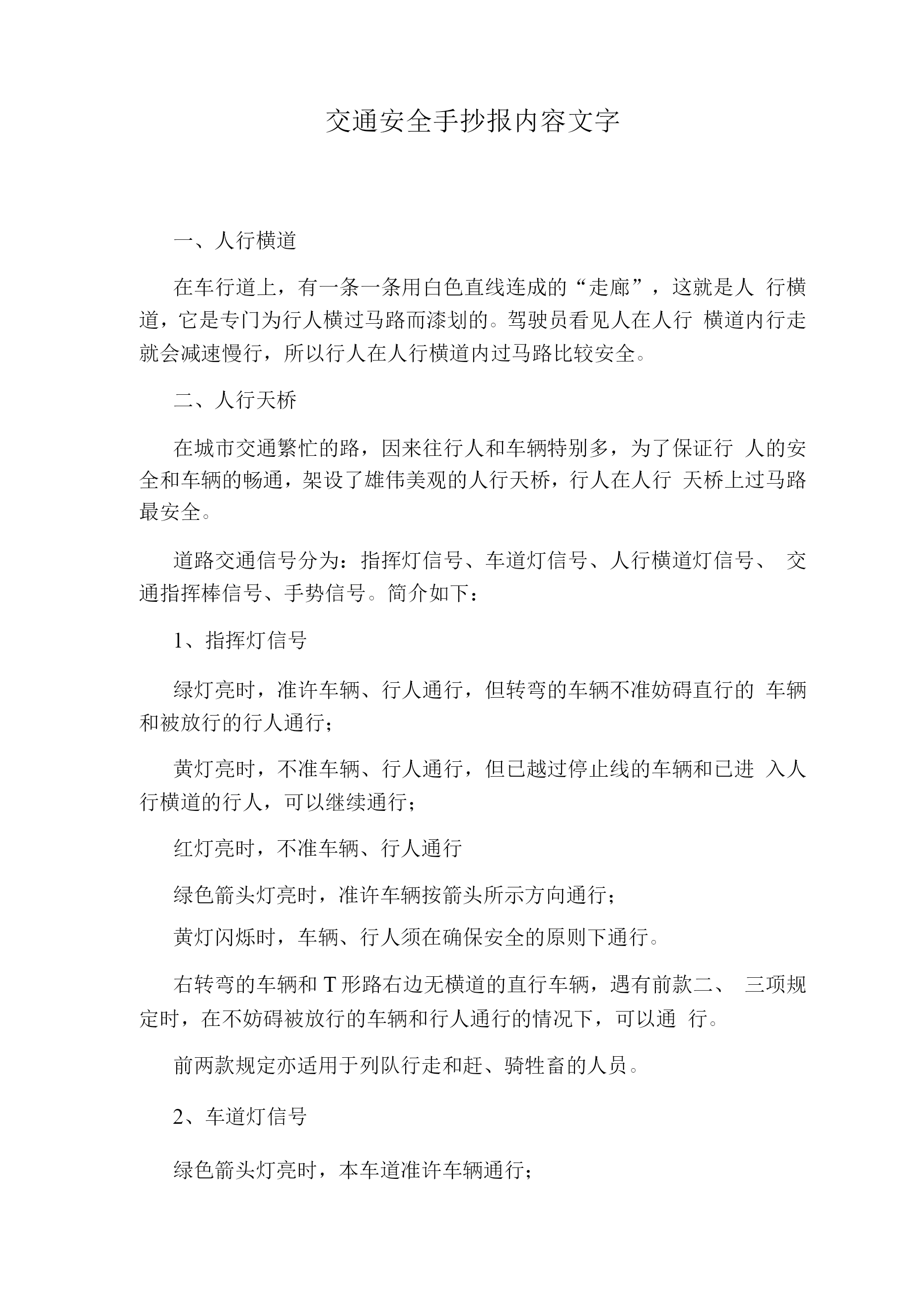交通安全手抄报内容文字一、人行横道在车行道上,有一条一条用白色直线连成的“走廊”,这就是人行横道,它是专门为行人横过马路而漆划的。驾驶员看见人在人行横道内行走就会减速慢行,所以行人在人行横道内过马路比较安全。二、人行天桥在城市交通繁忙的路,因来往行人和车辆特别多,为了保证行人的安全和车辆的畅通,架设了雄伟美观的人行天桥,行人在人行天桥上过马路最安全。道路交通信号分为:指挥灯信号、车道灯信号、人行横道灯信号、交通指挥棒信号、手势信号。简介如下:1、指挥灯信号绿灯亮时,准许车辆、行人通行,但转弯的车辆不准妨碍