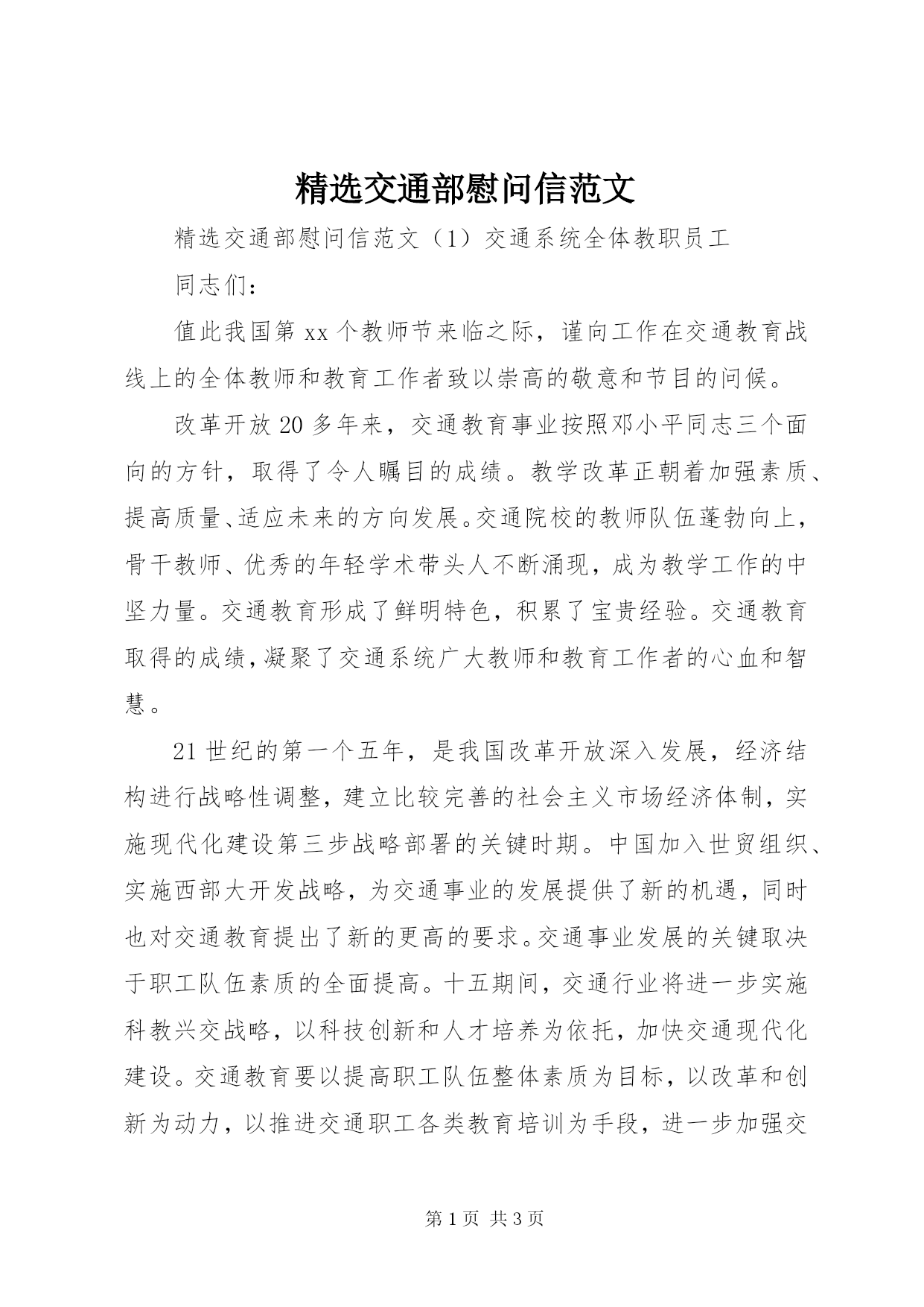 第PAGE\*Arabic\*MERGEFORMAT3页共NUMPAGES\*MERGEFORMAT3页精选交通部慰问信范文精选交通部慰问信范文(1)交通系统全体教职员工同志们:值此我国第xx个教师节来临之际,谨向工作在交通教育战线上的全体教师和教育工作者致以崇高的敬意和节目的问候。改革开放20多年来,交通教育事业按照邓小平同志三个面向的方针,取得了令人瞩目的成绩。教学改革正朝着加强素质、提高质量、适应未来的方向发展。交通院校的教师队伍蓬勃向上,骨干教师、优秀的年轻学术带头人不断涌现,成为教学