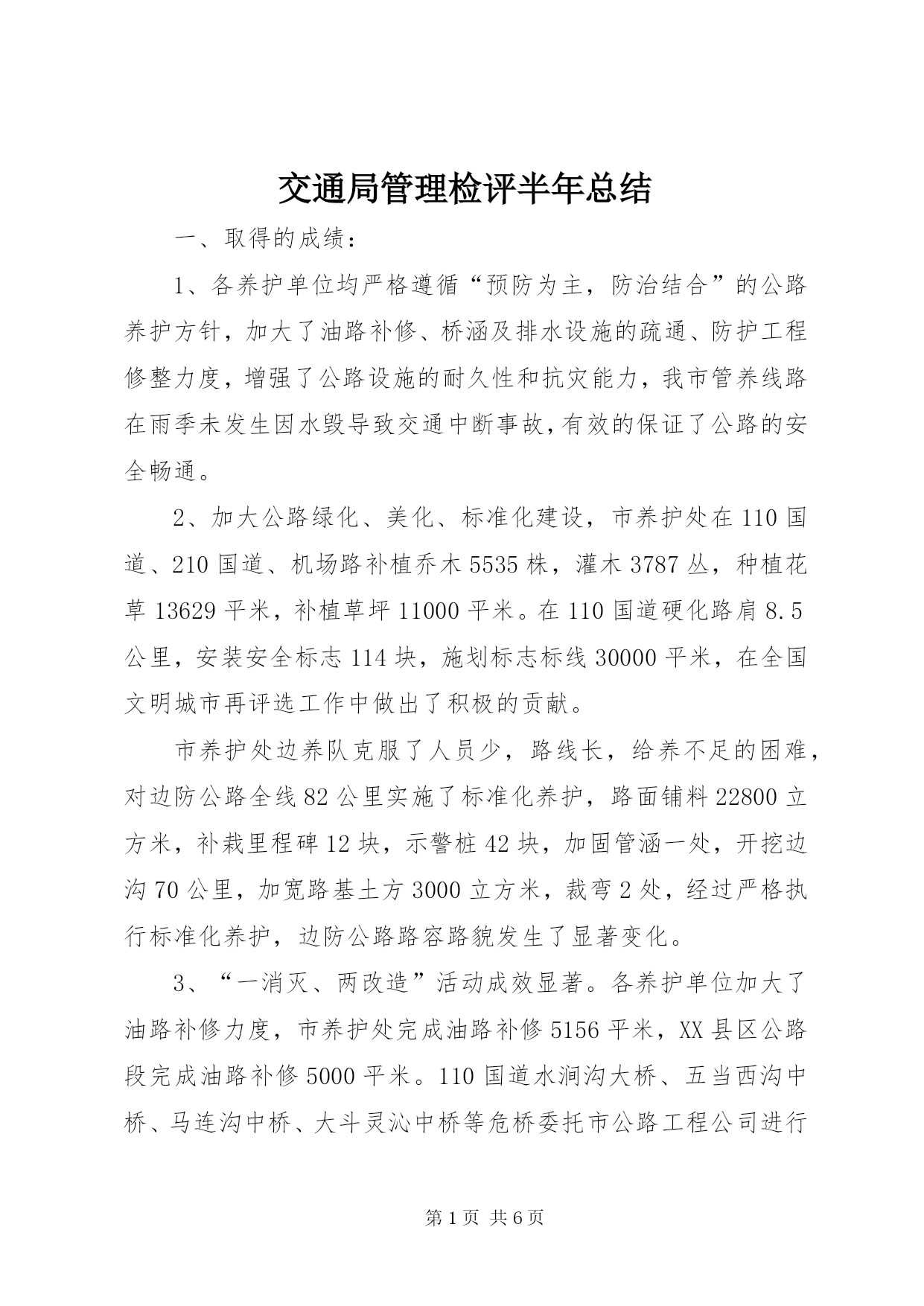 第PAGE\*Arabic\*MERGEFORMAT6页共NUMPAGES\*MERGEFORMAT6页交通局管理检评半年总结一、取得的成绩:1、各养护单位均严格遵循“预防为主,防治结合”的公路养护方针,加大了油路补修、桥涵及排水设施的疏通、防护工程修整力度,增强了公路设施的耐久性和抗灾能力,我市管养线路在雨季未发生因水毁导致交通中断事故,有效的保证了公路的安全畅通。2、加大公路绿化、美化、标准化建设,市养护处在110国道、210国道、机场路补植乔木5535株,灌木3787丛,种植花草1362