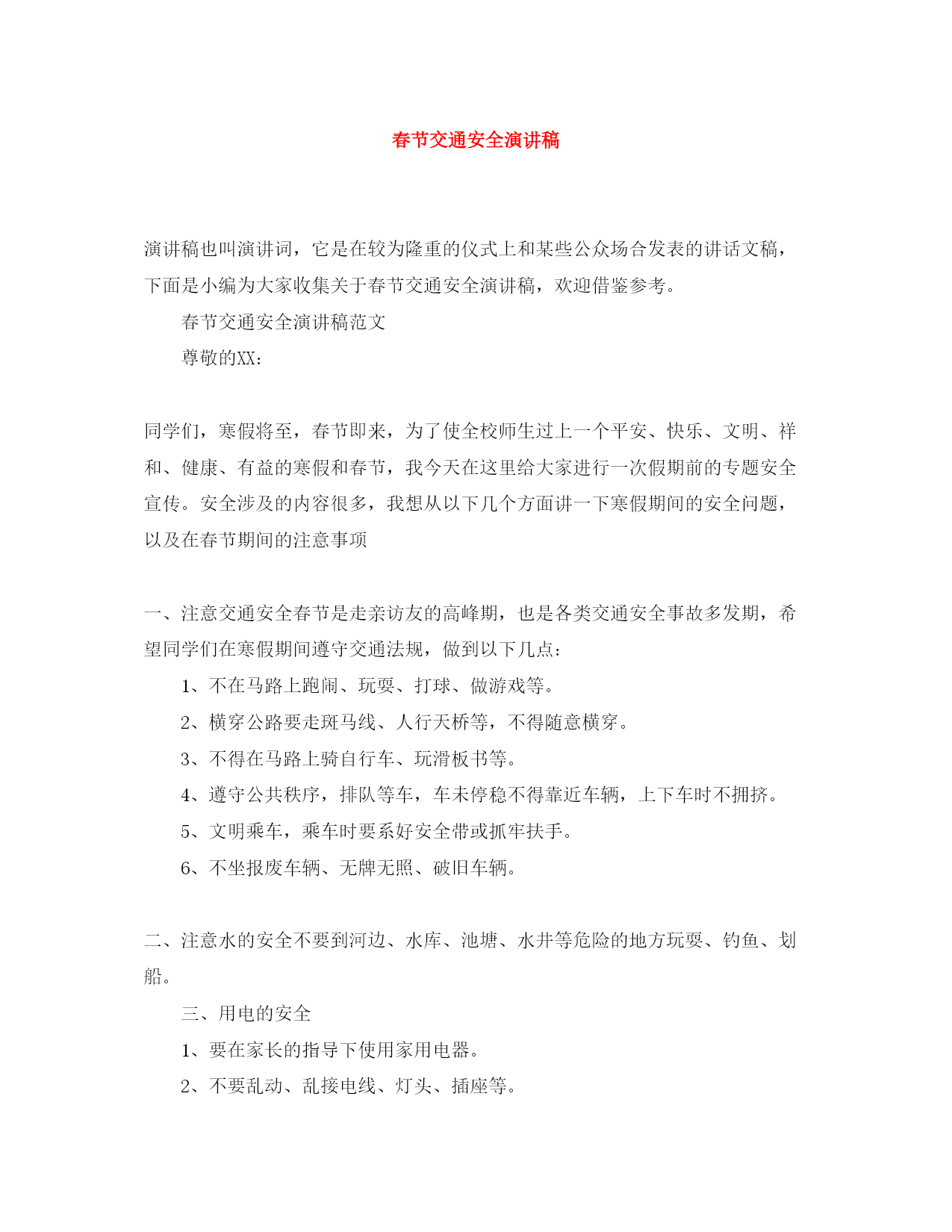 此资料由网络收集而来,如有侵权请告知上传者立即删除。资料共分享,我们负责传递知识。春节交通安全演讲稿演讲稿也叫演讲词,它是在较为隆重的仪式上和某些公众场合发表的讲话文稿,下面是小编为大家收集关于春节交通安全演讲稿,欢迎借鉴参考。春节交通安全演讲稿范文尊敬的XX:同学们,寒假将至,春节即来,为了使全校师生过上一个平安、快乐、文明、祥和、健康、有益的寒假和春节,我今天在这里给大家进行一次假期前的专题安全宣传。安全涉及的内容很多,我想从以下几个方面讲一下寒假期间的安全问题,以及在春节期间的注意事项一、注意交通安
