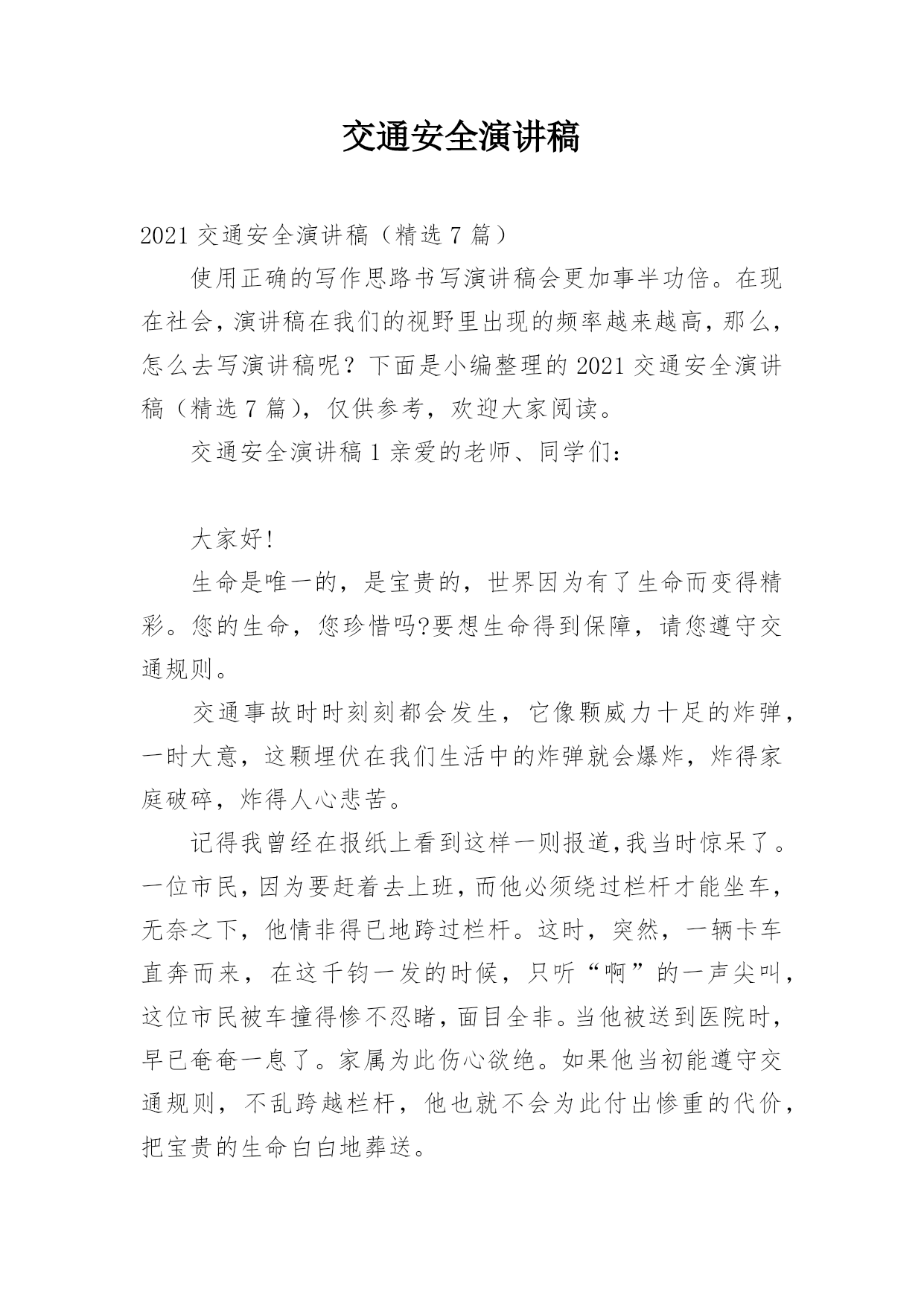 交通安全演讲稿2021交通安全演讲稿(精选7篇)使用正确的写作思路书写演讲稿会更加事半功倍。在现在社会,演讲稿在我们的视野里出现的频率越来越高,那么,怎么去写演讲稿呢?下面是小编整理的2021交通安全演讲稿(精选7篇),仅供参考,欢迎大家阅读。交通安全演讲稿1亲爱的老师、同学们:大家好!生命是唯一的,是宝贵的,世界因为有了生命而变得精彩。您的生命,您珍惜吗?要想生命得到保障,请您遵守交通规则。交通事故时时刻刻都会发生,它像颗威力十足的炸弹,一时大意,这颗埋伏在我们生活中的炸弹就会爆炸,炸得家庭破碎,炸得人