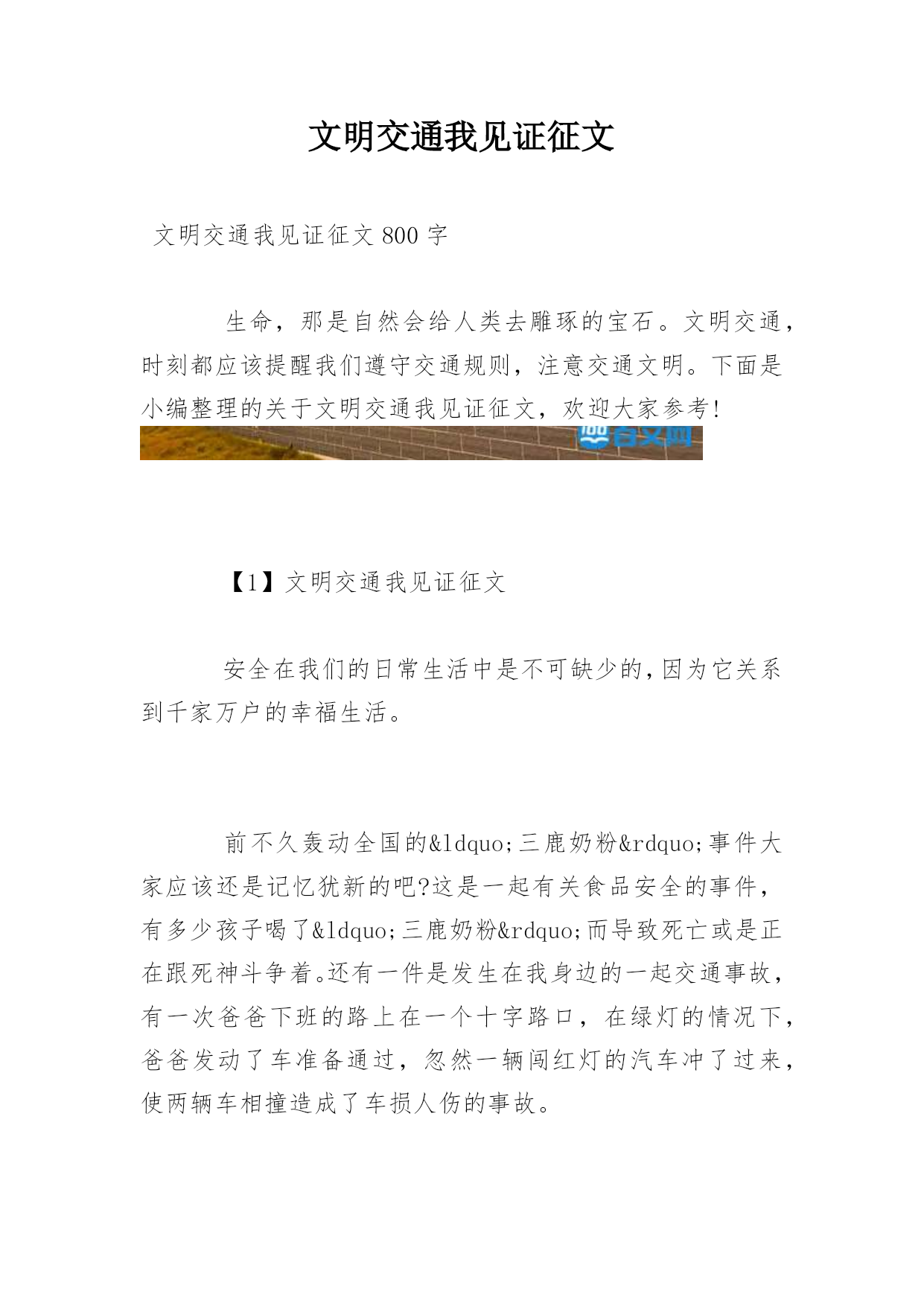 文明交通我见证征文文明交通我见证征文800字生命,那是自然会给人类去雕琢的宝石。文明交通,时刻都应该提醒我们遵守交通规则,注意交通文明。下面是小编整理的关于文明交通我见证征文,欢迎大家参考!【1】文明交通我见证征文安全在我们的日常生活中是不可缺少的,因为它关系到千家万户的幸福生活。前不久轰动全国的“三鹿奶粉”事件大家应该还是记忆犹新的吧?这是一起有关食品安全的事件,有多少孩子喝了“三鹿奶粉”而导致死亡或是正在跟死神斗争着。还有一件是发生在我身边的一起交通事故
