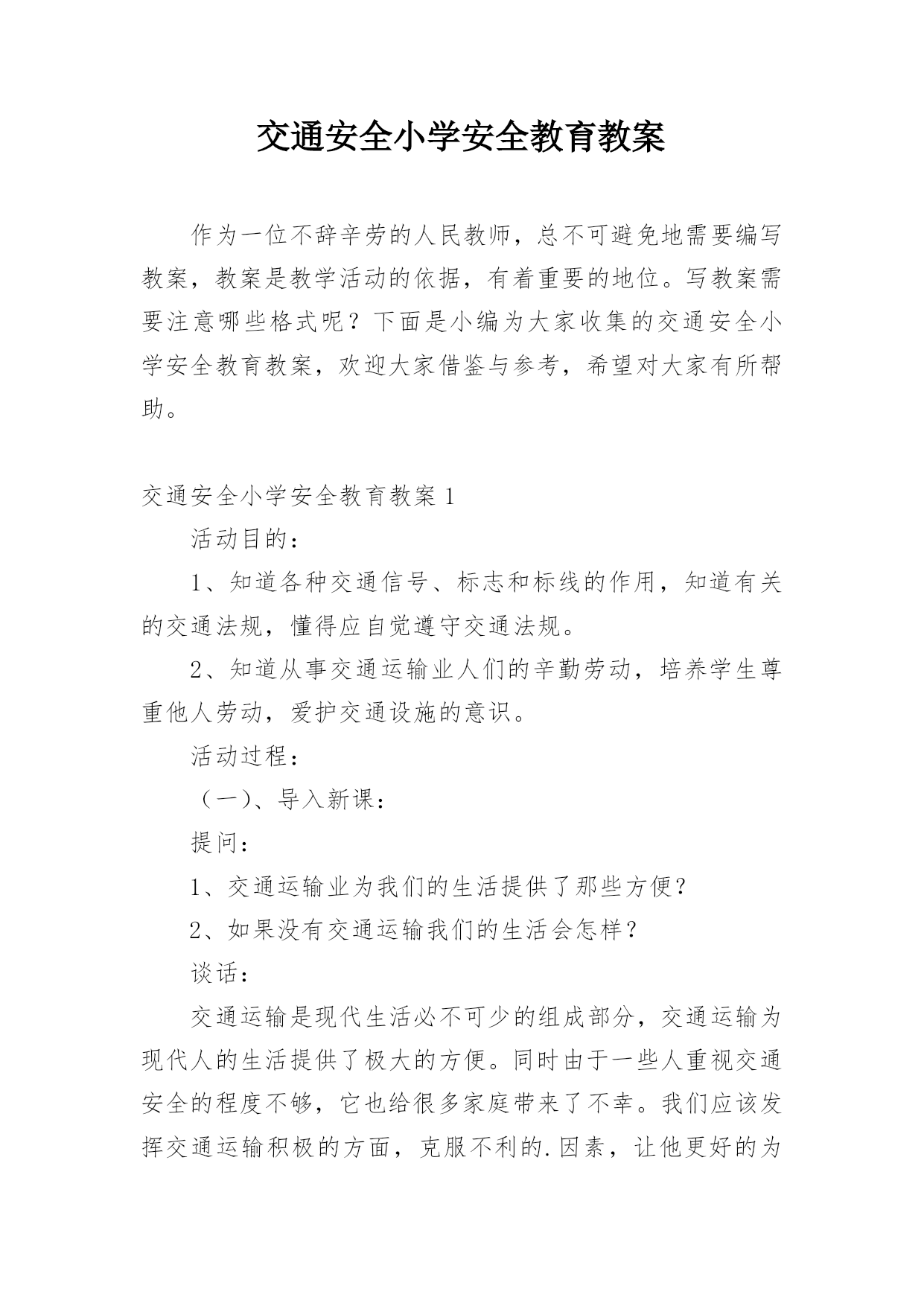 交通安全小学安全教育教案作为一位不辞辛劳的人民教师,总不可避免地需要编写教案,教案是教学活动的依据,有着重要的地位。写教案需要注意哪些格式呢?下面是小编为大家收集的交通安全小学安全教育教案,欢迎大家借鉴与参考,希望对大家有所帮助。交通安全小学安全教育教案1活动目的:1、知道各种交通信号、标志和标线的作用,知道有关的交通法规,懂得应自觉遵守交通法规。2、知道从事交通运输业人们的辛勤劳动,培养学生尊重他人劳动,爱护交通设施的意识。活动过程:(一)、导入新课:提问:1、交通运输业为我们的生活提供了那些方便?2、