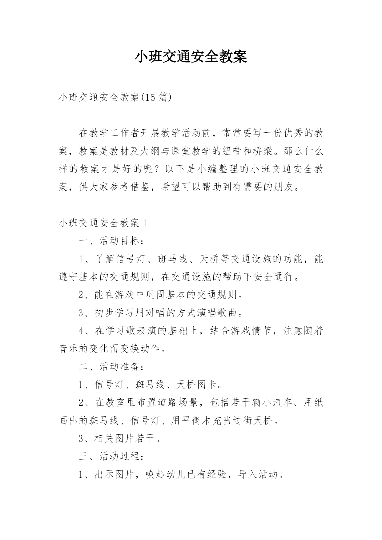 小班交通安全教案小班交通安全教案(15篇)在教学工作者开展教学活动前,常常要写一份优秀的教案,教案是教材及大纲与课堂教学的纽带和桥梁。那么什么样的教案才是好的呢?以下是小编整理的小班交通安全教案,供大家参考借鉴,希望可以帮助到有需要的朋友。小班交通安全教案1一、活动目标:1、了解信号灯、斑马线、天桥等交通设施的功能,能遵守基本的交通规则,在交通设施的帮助下安全通行。2、能在游戏中巩固基本的交通规则。3、初步学习用对唱的方式演唱歌曲。4、在学习歌表演的基础上,结合游戏情节,注意随着音乐的变化而变换动作。二、