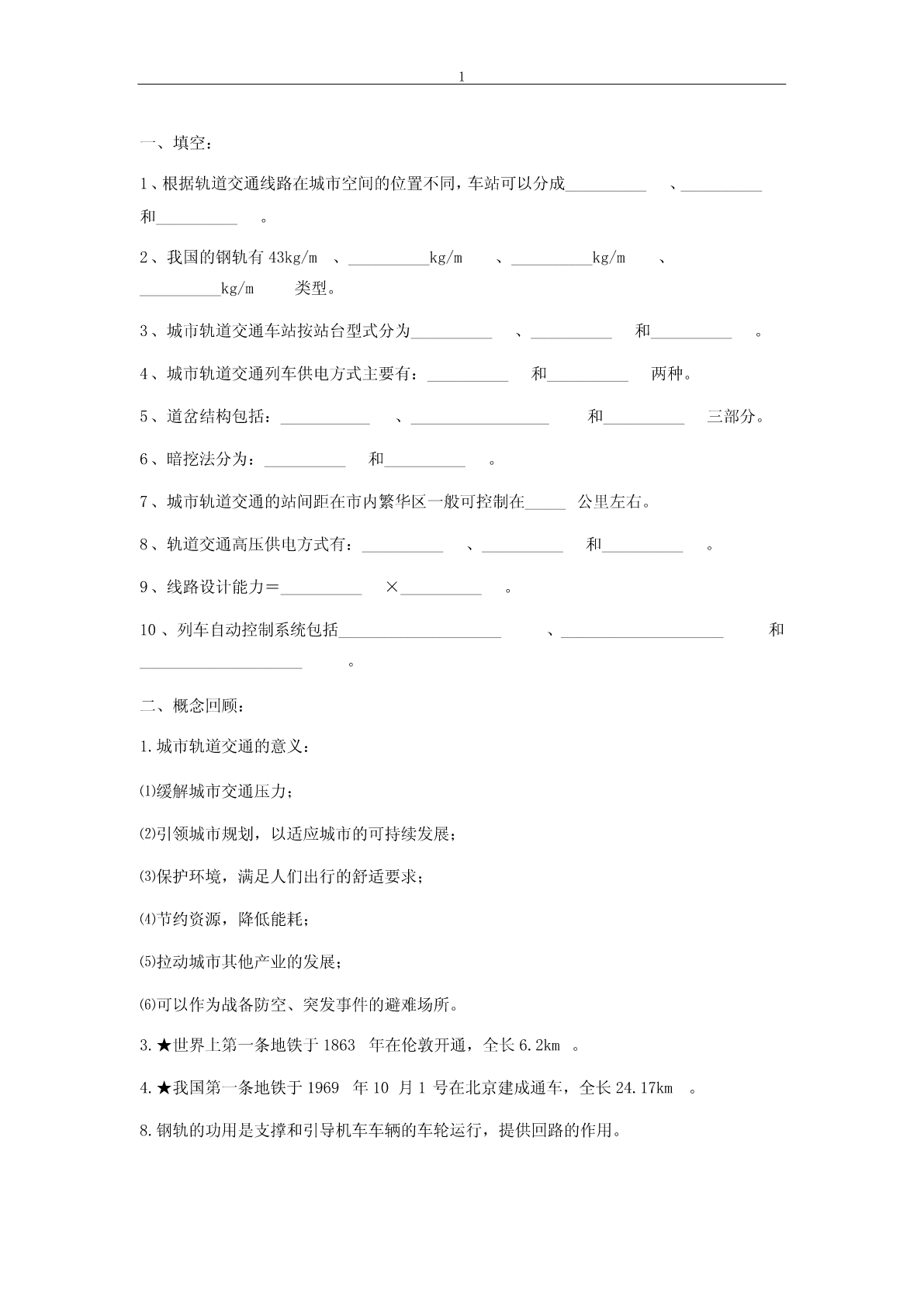 1一、填空:1、根据轨道交通线路在城市空间的位置不同,车站可以分成__________、__________和__________。2、我国的钢轨有43kg/m、__________kg/m、__________kg/m、__________kg/m类型。3、城市轨道交通车站按站台型式分为__________、__________和__________。4、城市轨道交通列车供电方式主要有:__________和__________两种。5、道岔结构包括:___________、______________