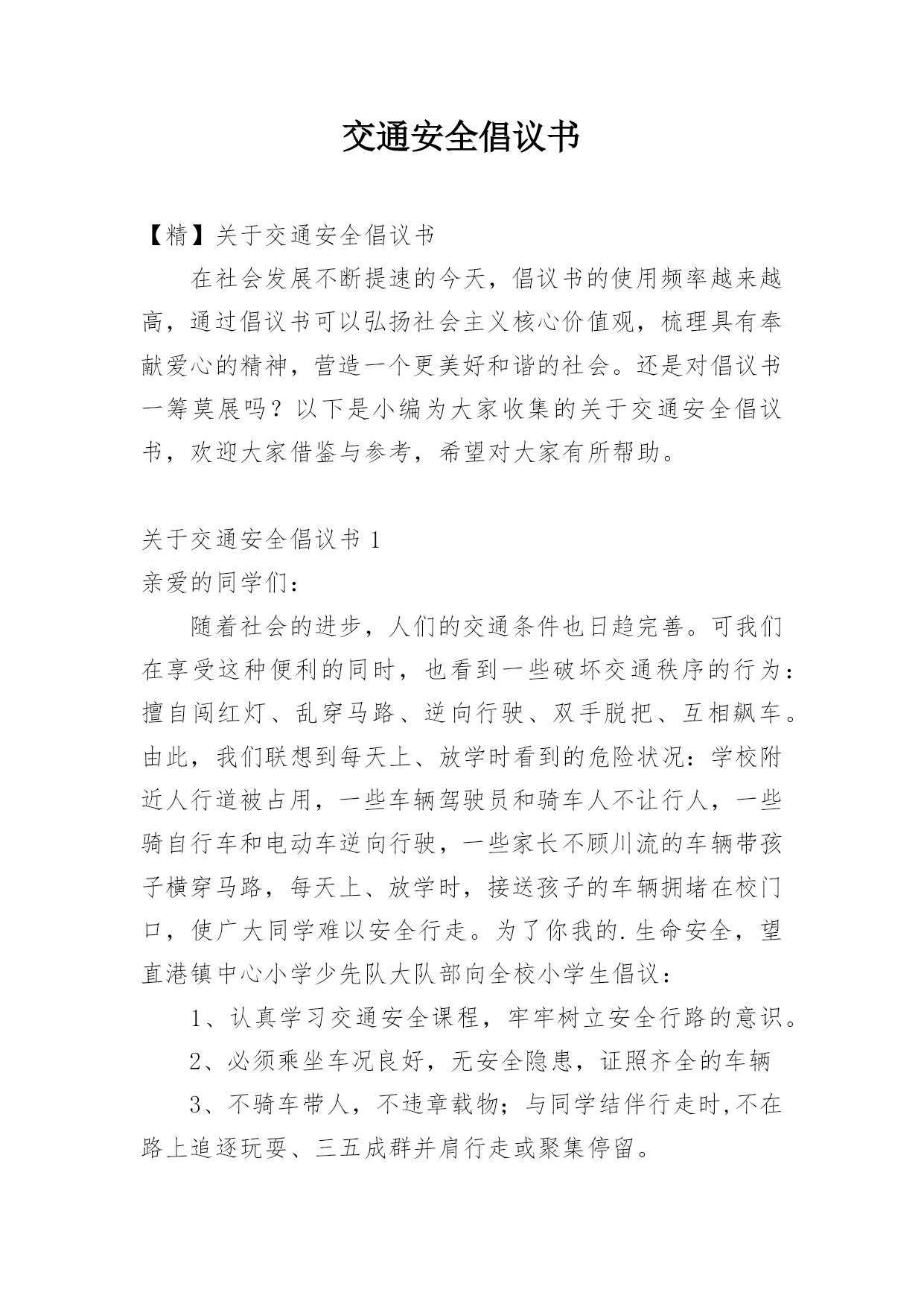 交通安全倡议书【精】关于交通安全倡议书在社会发展不断提速的今天,倡议书的使用频率越来越高,通过倡议书可以弘扬社会主义核心价值观,梳理具有奉献爱心的精神,营造一个更美好和谐的社会。还是对倡议书一筹莫展吗?以下是小编为大家收集的关于交通安全倡议书,欢迎大家借鉴与参考,希望对大家有所帮助。关于交通安全倡议书1亲爱的同学们:随着社会的进步,人们的交通条件也日趋完善。可我们在享受这种便利的同时,也看到一些破坏交通秩序的行为:擅自闯红灯、乱穿马路、逆向行驶、双手脱把、互相飙车。由此,我们联想到每天上、放学时看到的危险