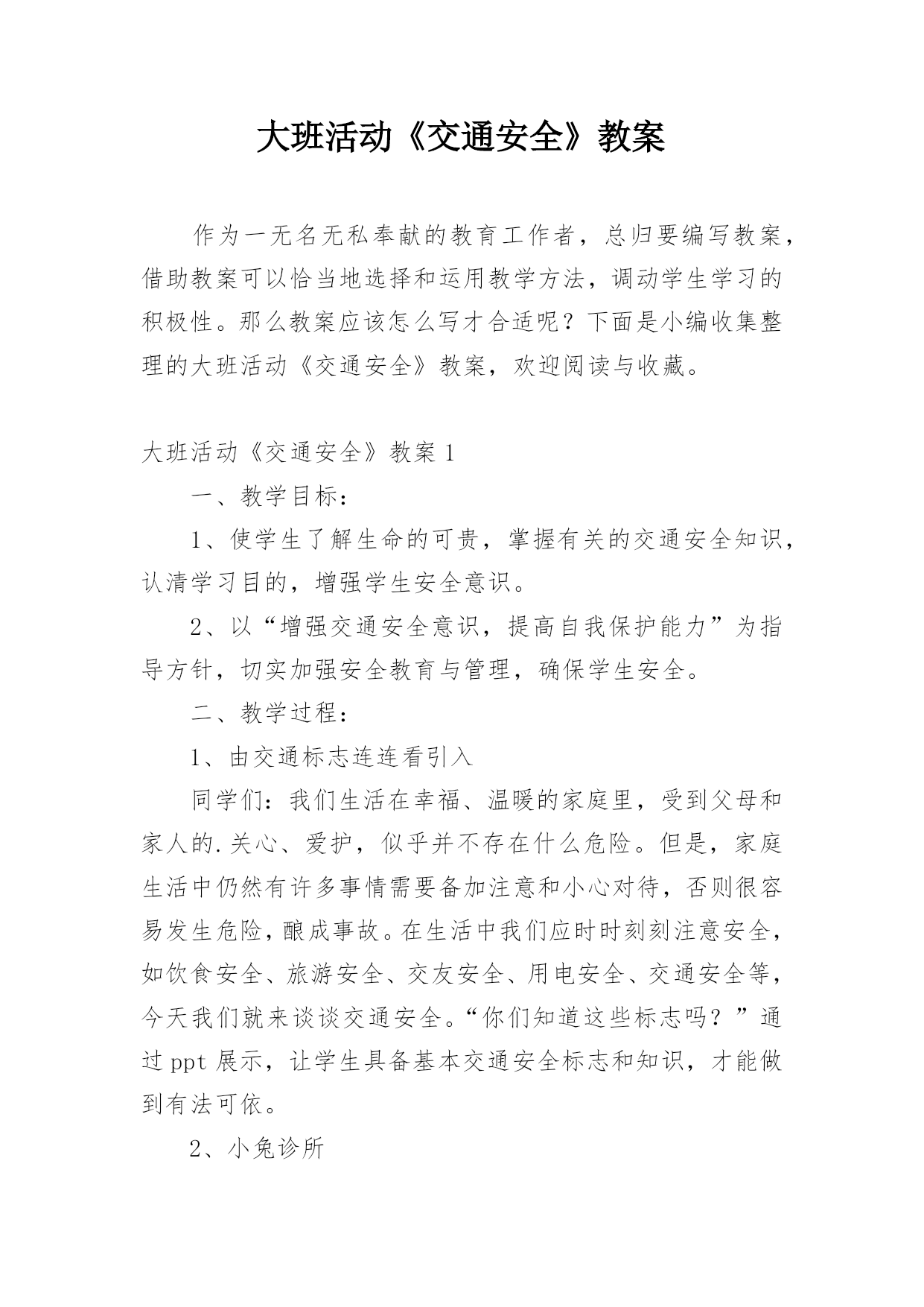 大班活动《交通安全》教案作为一无名无私奉献的教育工作者,总归要编写教案,借助教案可以恰当地选择和运用教学方法,调动学生学习的积极性。那么教案应该怎么写才合适呢?下面是小编收集整理的大班活动《交通安全》教案,欢迎阅读与收藏。大班活动《交通安全》教案1一、教学目标:1、使学生了解生命的可贵,掌握有关的交通安全知识,认清学习目的,增强学生安全意识。2、以“增强交通安全意识,提高自我保护能力”为指导方针,切实加强安全教育与管理,确保学生安全。二、教学过程:1、由交通标志连连看引入同学们:我们生活在幸福、温暖的家庭