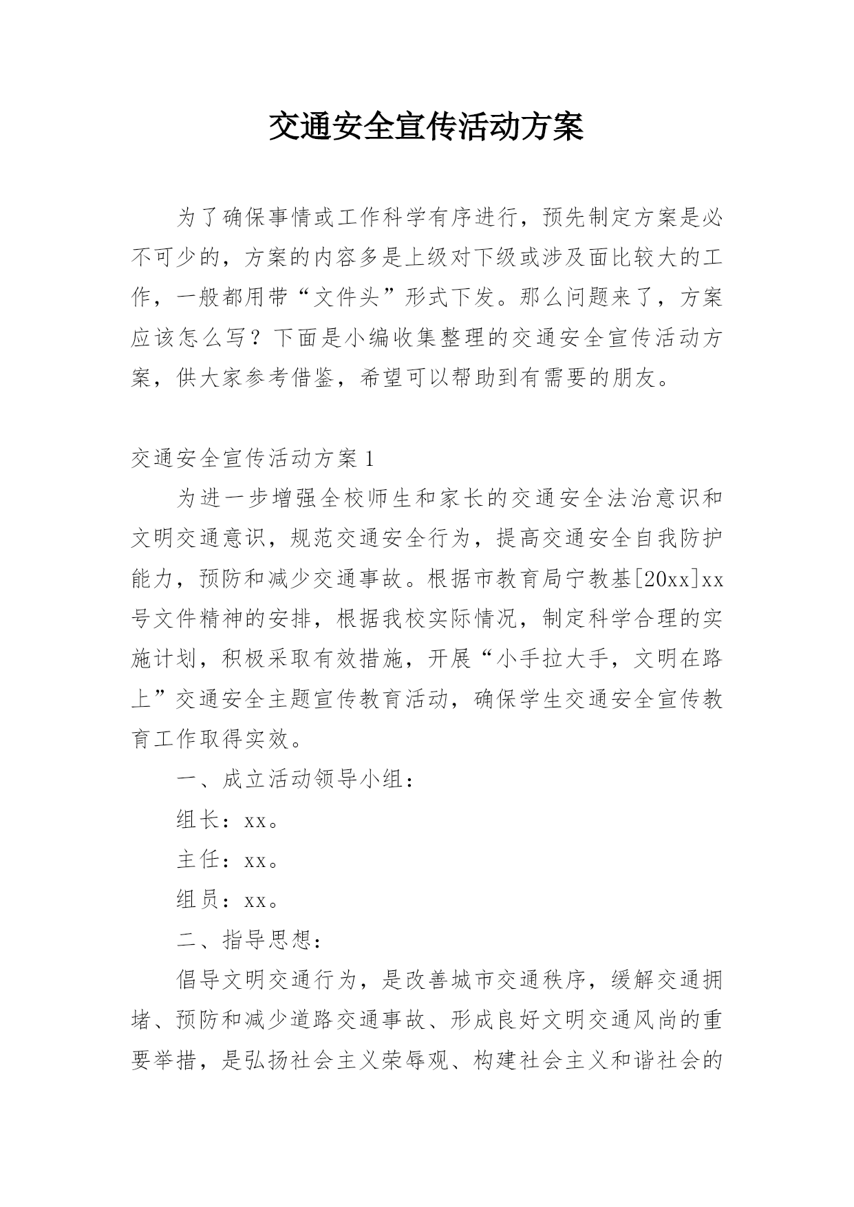 交通安全宣传活动方案为了确保事情或工作科学有序进行,预先制定方案是必不可少的,方案的内容多是上级对下级或涉及面比较大的工作,一般都用带“文件头”形式下发。那么问题来了,方案应该怎么写?下面是小编收集整理的交通安全宣传活动方案,供大家参考借鉴,希望可以帮助到有需要的朋友。交通安全宣传活动方案1为进一步增强全校师生和家长的交通安全法治意识和文明交通意识,规范交通安全行为,提高交通安全自我防护能力,预防和减少交通事故。根据市教育局宁教基[20xx]xx号文件精神的安排,根据我校实际情况,制定科学合理的实施计划,