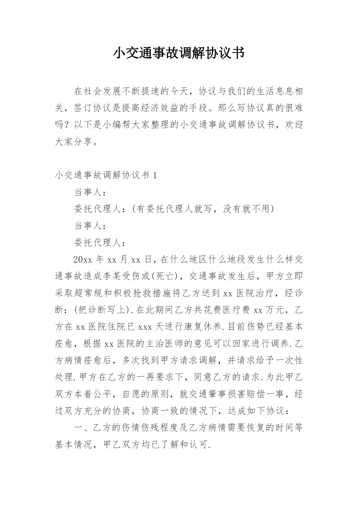 小交通事故调解协议书在社会发展不断提速的今天,协议与我们的生活息息相关,签订协议是提高经济效益的手段。那么写协议真的很难吗?以下是小编帮大家整理的小交通事故调解协议书,欢迎大家分享。小交通事故调解协议书1当事人:委托代理人:(有委托代理人就写,没有就不用)当事人:委托代理人:20xx年xx月xx日,在什么地区什么地段发生什么样交通事故造成李某受伤或(死亡),交通事故发生后,甲方立即采取超常规和积极抢救措施将乙方送到xx医院治疗,经诊断:(把诊断写上).在此期间乙方共花费医疗费xx万元,乙方在xx医院住院已