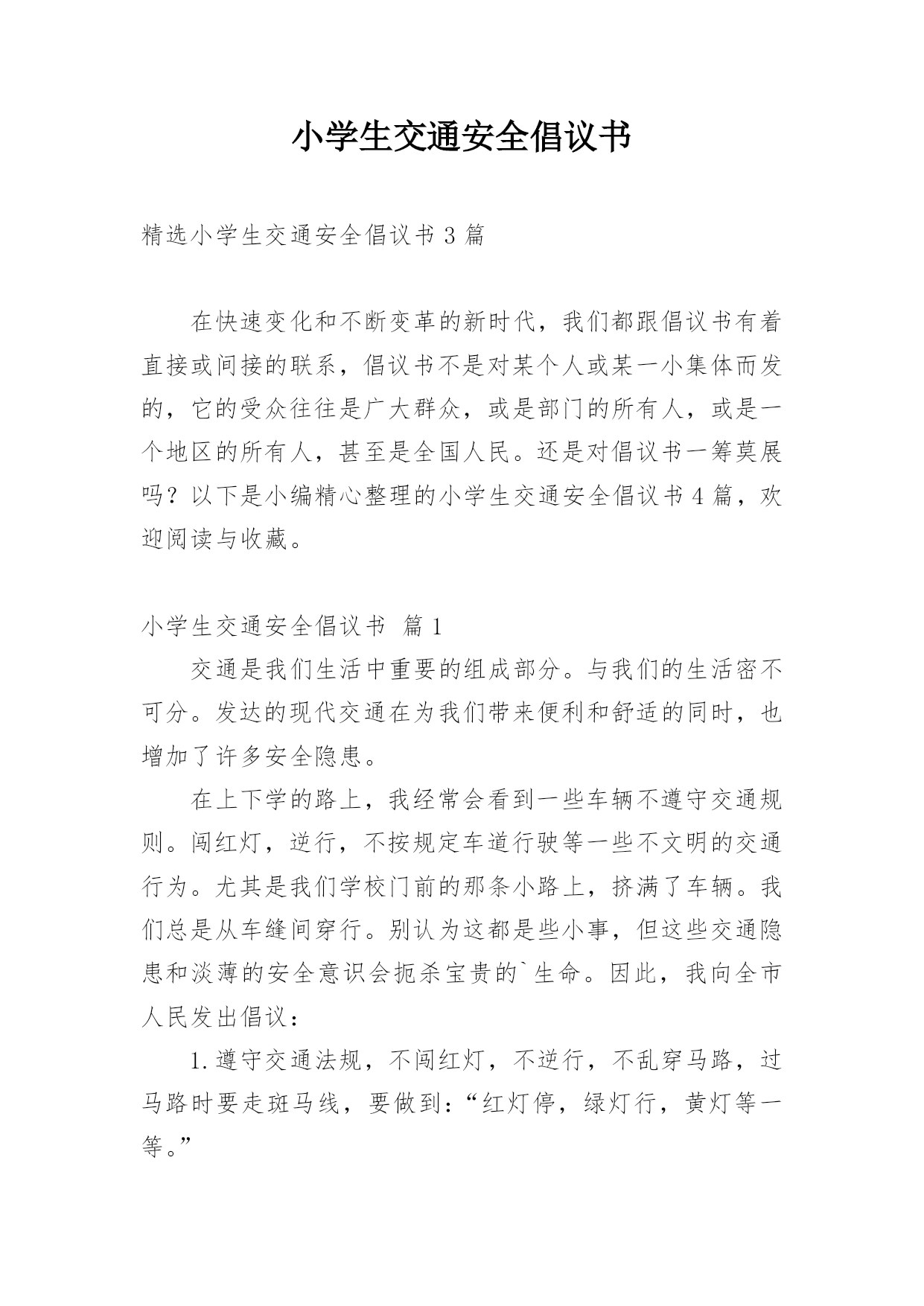 小学生交通安全倡议书精选小学生交通安全倡议书3篇在快速变化和不断变革的新时代,我们都跟倡议书有着直接或间接的联系,倡议书不是对某个人或某一小集体而发的,它的受众往往是广大群众,或是部门的所有人,或是一个地区的所有人,甚至是全国人民。还是对倡议书一筹莫展吗?以下是小编精心整理的小学生交通安全倡议书4篇,欢迎阅读与收藏。小学生交通安全倡议书篇1交通是我们生活中重要的组成部分。与我们的生活密不可分。发达的现代交通在为我们带来便利和舒适的同时,也增加了许多安全隐患。在上下学的路上,我经常会看到一些车辆不遵守交通规