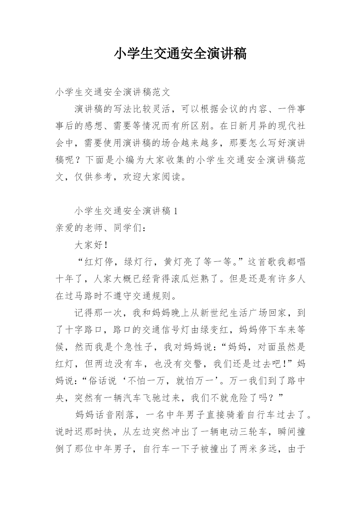 小学生交通安全演讲稿小学生交通安全演讲稿范文演讲稿的写法比较灵活,可以根据会议的内容、一件事事后的感想、需要等情况而有所区别。在日新月异的现代社会中,需要使用演讲稿的场合越来越多,那要怎么写好演讲稿呢?下面是小编为大家收集的小学生交通安全演讲稿范文,仅供参考,欢迎大家阅读。小学生交通安全演讲稿1亲爱的老师、同学们:大家好!“红灯停,绿灯行,黄灯亮了等一等。”这首歌我都唱十年了,人家大概已经背得滚瓜烂熟了。但是还是有许多人在过马路时不遵守交通规则。记得那一次,我和妈妈晚上从新世纪生活广场回家,到了十字路口,