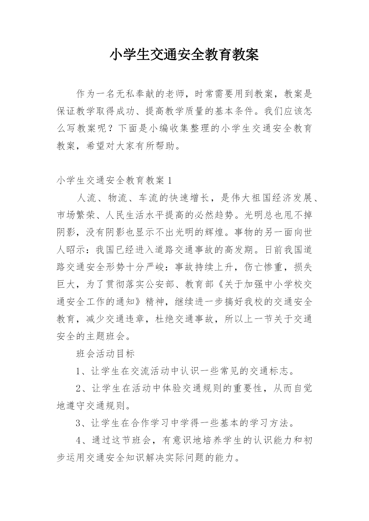 小学生交通安全教育教案作为一名无私奉献的老师,时常需要用到教案,教案是保证教学取得成功、提高教学质量的基本条件。我们应该怎么写教案呢?下面是小编收集整理的小学生交通安全教育教案,希望对大家有所帮助。小学生交通安全教育教案1人流、物流、车流的快速增长,是伟大祖国经济发展、市场繁荣、人民生活水平提高的必然趋势。光明总也甩不掉阴影,没有阴影也显示不出光明的辉煌。事物的另一面向世人昭示:我国已经进入道路交通事故的高发期。日前我国道路交通安全形势十分严峻:事故持续上升,伤亡惨重,损失巨大,为了贯彻落实公安部、教育部