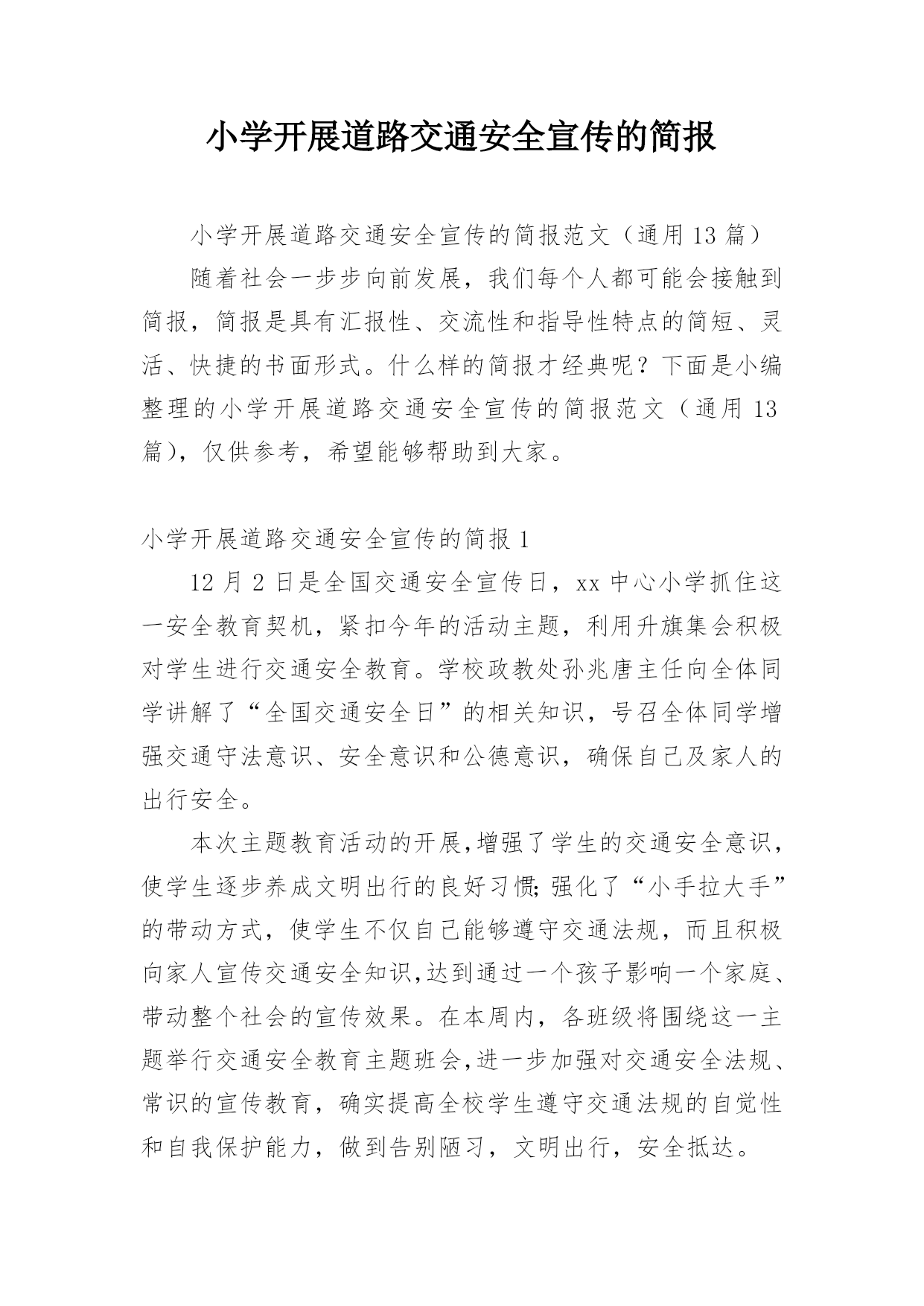 小学开展道路交通安全宣传的简报小学开展道路交通安全宣传的简报范文(通用13篇)随着社会一步步向前发展,我们每个人都可能会接触到简报,简报是具有汇报性、交流性和指导性特点的简短、灵活、快捷的书面形式。什么样的简报才经典呢?下面是小编整理的小学开展道路交通安全宣传的简报范文(通用13篇),仅供参考,希望能够帮助到大家。小学开展道路交通安全宣传的简报112月2日是全国交通安全宣传日,xx中心小学抓住这一安全教育契机,紧扣今年的活动主题,利用升旗集会积极对学生进行交通安全教育。学校政教处孙兆唐主任向全体同学讲解了