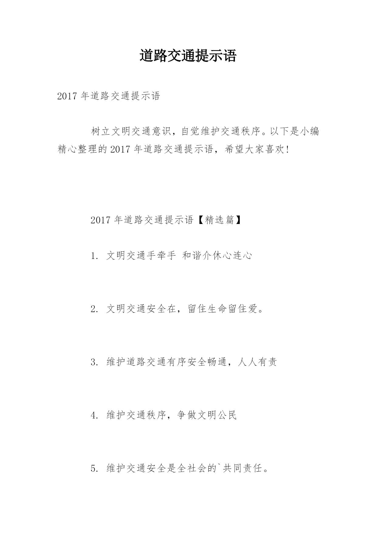 道路交通提示语2017年道路交通提示语树立文明交通意识,自觉维护交通秩序。以下是小编精心整理的2017年道路交通提示语,希望大家喜欢!2017年道路交通提示语【精选篇】1.文明交通手牵手和谐介休心连心2.文明交通安全在,留住生命留住爱。3.维护道路交通有序安全畅通,人人有责4.维护交通秩序,争做文明公民5.维护交通安全是全社会的`共同责任。6.维护道路交通秩序,预防和减少交通事故7.为了您和他人的幸福,请自觉遵守交通法规。违章是事故的隐患,事故是违章的恶果。8.违章使用灯光,给事故照亮9.违章含泪饮苦酒,