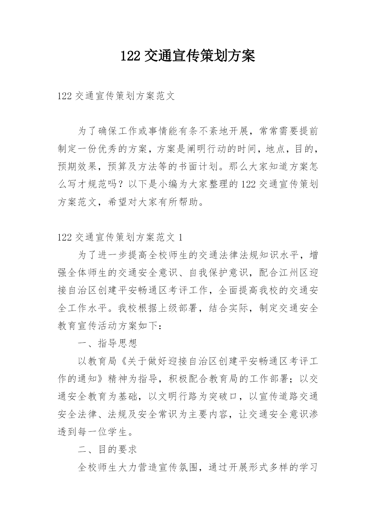 122交通宣传策划方案122交通宣传策划方案范文为了确保工作或事情能有条不紊地开展,常常需要提前制定一份优秀的方案,方案是阐明行动的时间,地点,目的,预期效果,预算及方法等的书面计划。那么大家知道方案怎么写才规范吗?以下是小编为大家整理的122交通宣传策划方案范文,希望对大家有所帮助。122交通宣传策划方案范文1为了进一步提高全校师生的交通法律法规知识水平,增强全体师生的交通安全意识、自我保护意识,配合江州区迎接自治区创建平安畅通区考评工作,全面提高我校的交通安全工作水平。我校根据上级部署,结合实际,制定