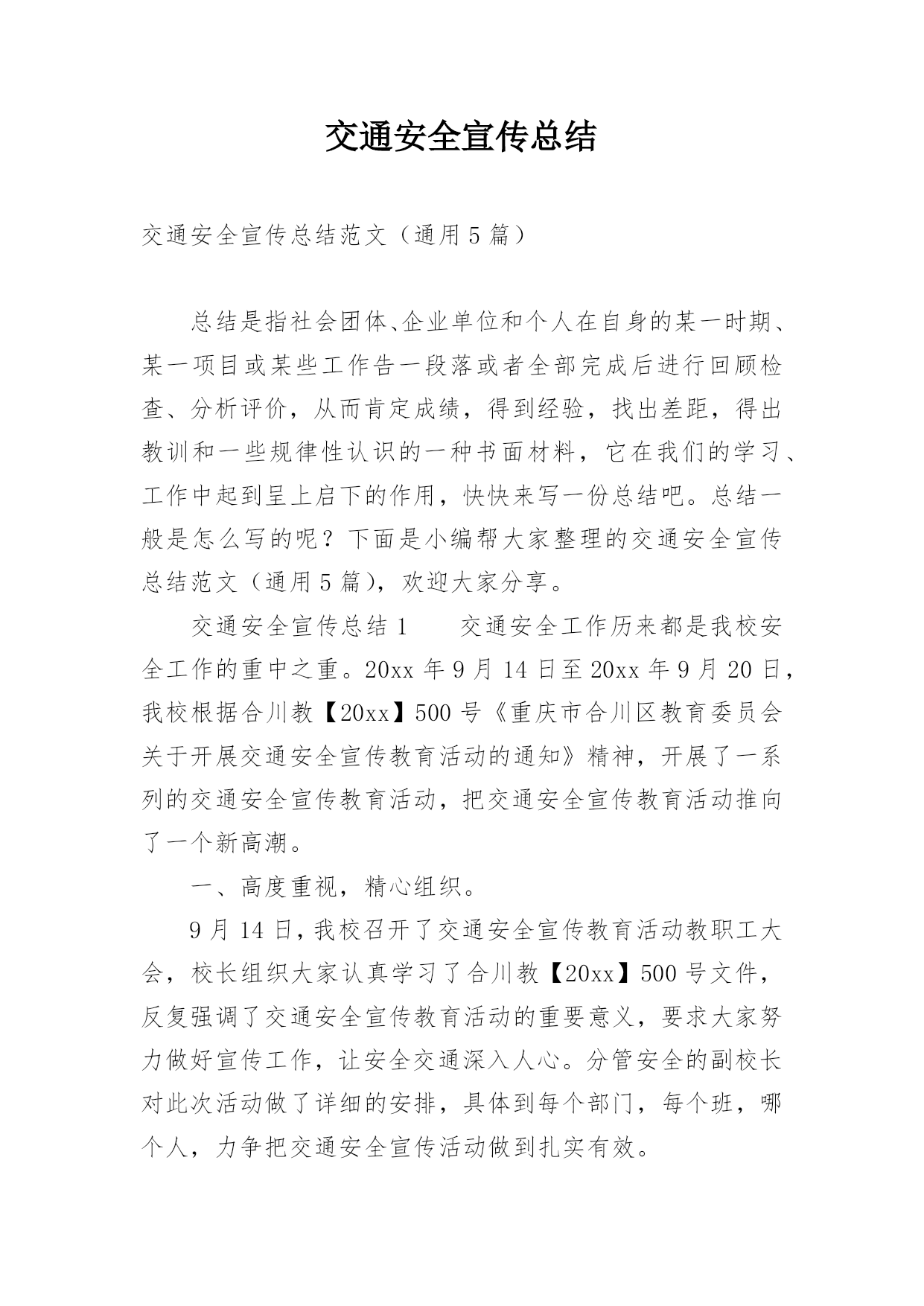 交通安全宣传总结交通安全宣传总结范文(通用5篇)总结是指社会团体、企业单位和个人在自身的某一时期、某一项目或某些工作告一段落或者全部完成后进行回顾检查、分析评价,从而肯定成绩,得到经验,找出差距,得出教训和一些规律性认识的一种书面材料,它在我们的学习、工作中起到呈上启下的作用,快快来写一份总结吧。总结一般是怎么写的呢?下面是小编帮大家整理的交通安全宣传总结范文(通用5篇),欢迎大家分享。交通安全宣传总结1交通安全工作历来都是我校安全工作的重中之重。20xx年9月14日至20xx年9月20日,我校根据合川教