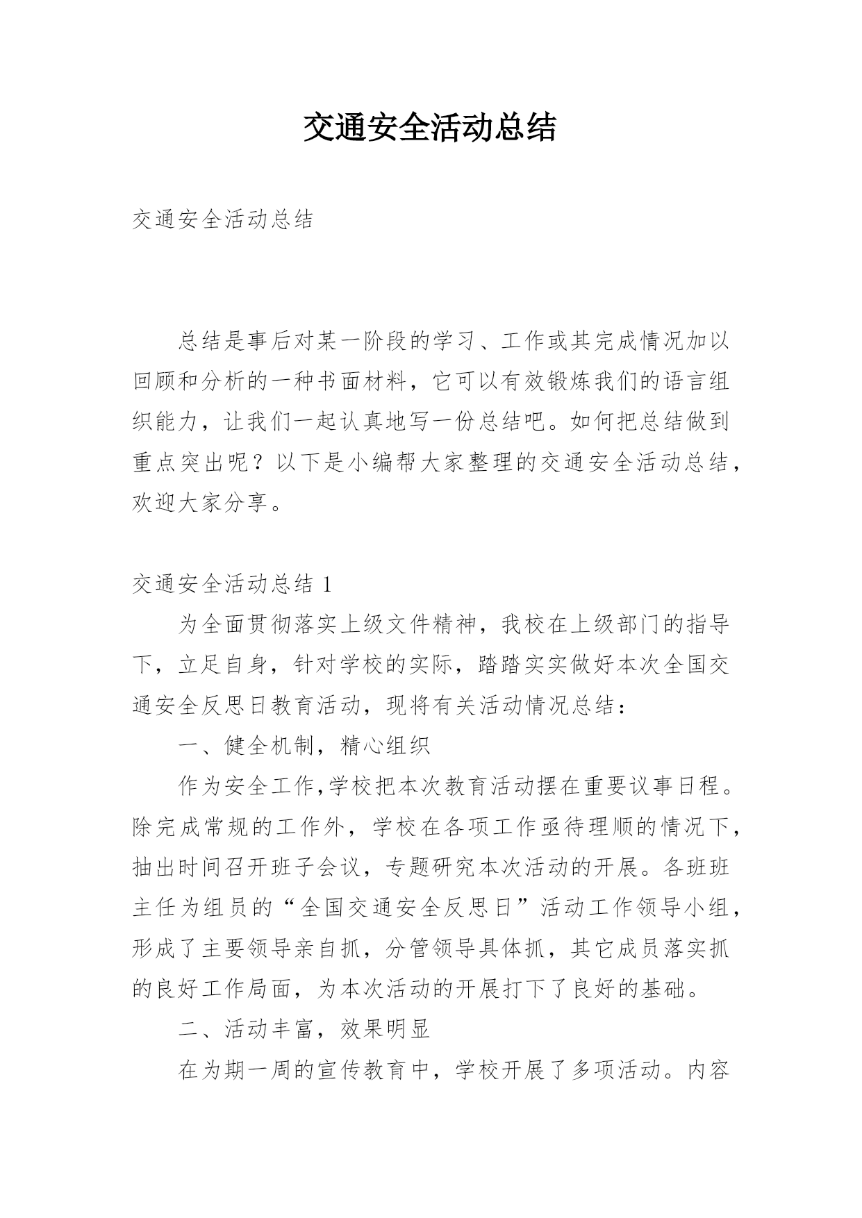 交通安全活动总结交通安全活动总结总结是事后对某一阶段的学习、工作或其完成情况加以回顾和分析的一种书面材料,它可以有效锻炼我们的语言组织能力,让我们一起认真地写一份总结吧。如何把总结做到重点突出呢?以下是小编帮大家整理的交通安全活动总结,欢迎大家分享。交通安全活动总结1为全面贯彻落实上级文件精神,我校在上级部门的指导下,立足自身,针对学校的实际,踏踏实实做好本次全国交通安全反思日教育活动,现将有关活动情况总结:一、健全机制,精心组织作为安全工作,学校把本次教育活动摆在重要议事日程。除完成常规的工作外,学校在