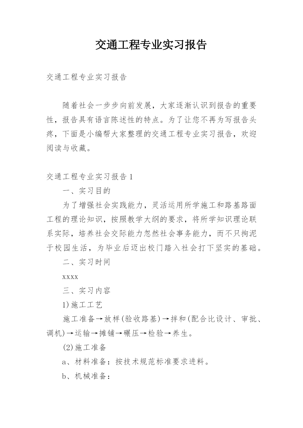 交通工程专业实习报告交通工程专业实习报告随着社会一步步向前发展,大家逐渐认识到报告的重要性,报告具有语言陈述性的特点。为了让您不再为写报告头疼,下面是小编帮大家整理的交通工程专业实习报告,欢迎阅读与收藏。交通工程专业实习报告1一、实习目的为了增强社会实践能力,灵活运用所学施工和路基路面工程的理论知识,按照教学大纲的要求,将所学知识理论联系实际,培养社会交际能力忽然社会事务能力,而不只拘泥于校园生活,为毕业后迈出校门踏入社会打下坚实的基础。二、实习时间xxxx三、实习内容1)施工工艺施工准备→放样(验收路基