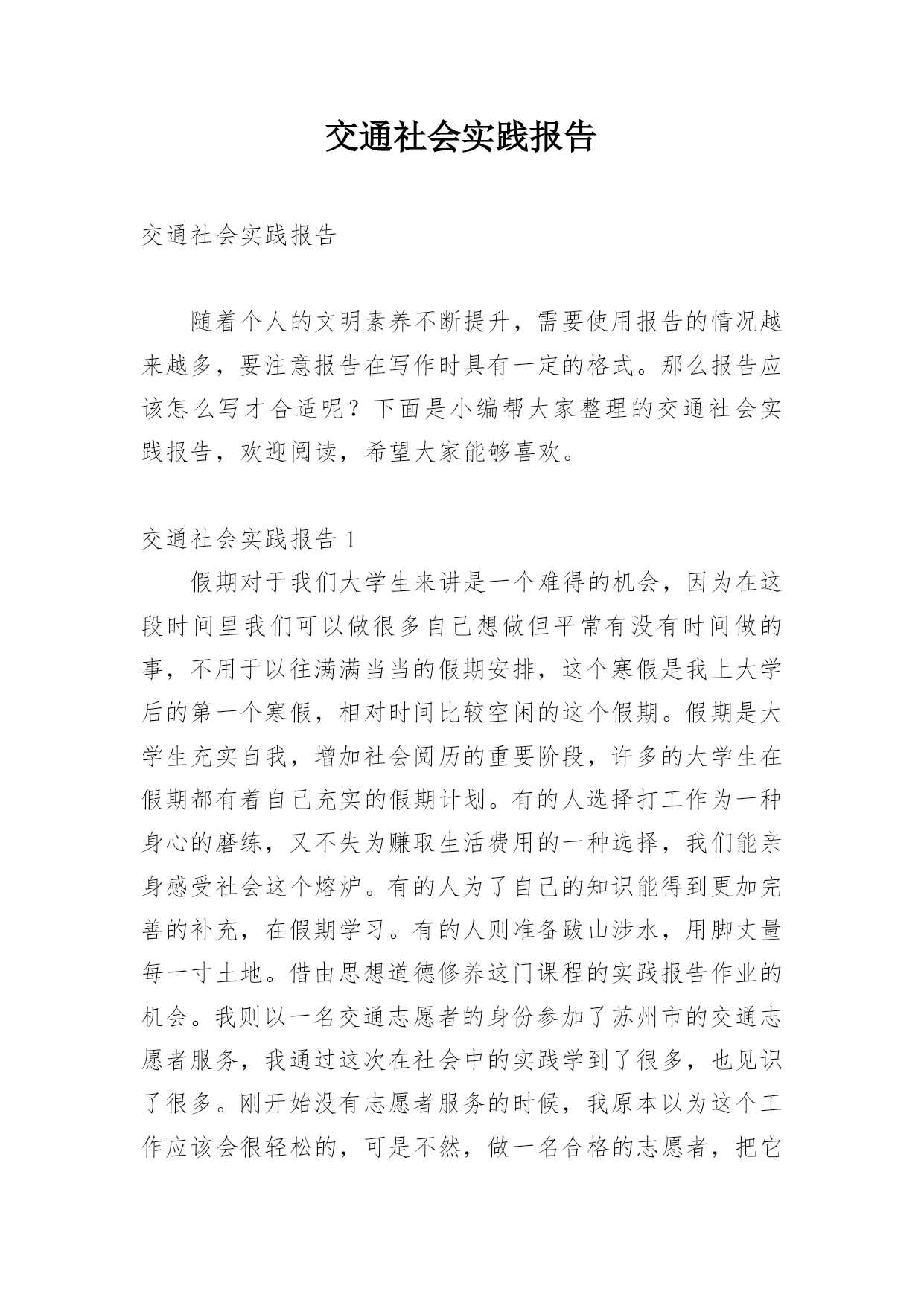 交通社会实践报告交通社会实践报告随着个人的文明素养不断提升,需要使用报告的情况越来越多,要注意报告在写作时具有一定的格式。那么报告应该怎么写才合适呢?下面是小编帮大家整理的交通社会实践报告,欢迎阅读,希望大家能够喜欢。交通社会实践报告1假期对于我们大学生来讲是一个难得的机会,因为在这段时间里我们可以做很多自己想做但平常有没有时间做的事,不用于以往满满当当的假期安排,这个寒假是我上大学后的第一个寒假,相对时间比较空闲的这个假期。假期是大学生充实自我,增加社会阅历的重要阶段,许多的大学生在假期都有着自己充实的